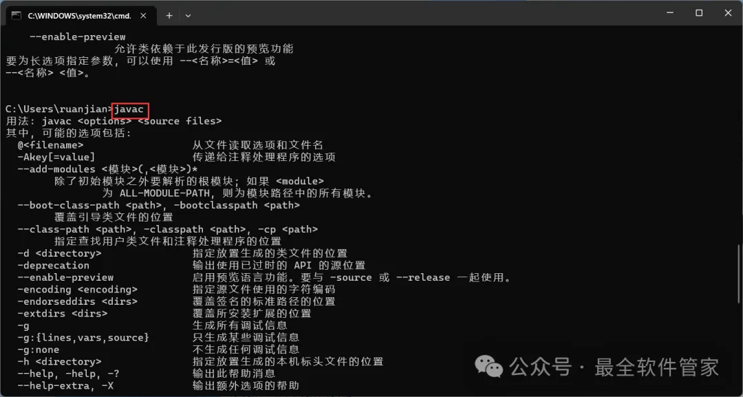11、输入:javac,,按下键盘上的【Enter】回车键,得到下列反馈,则JDK安装及配置成功