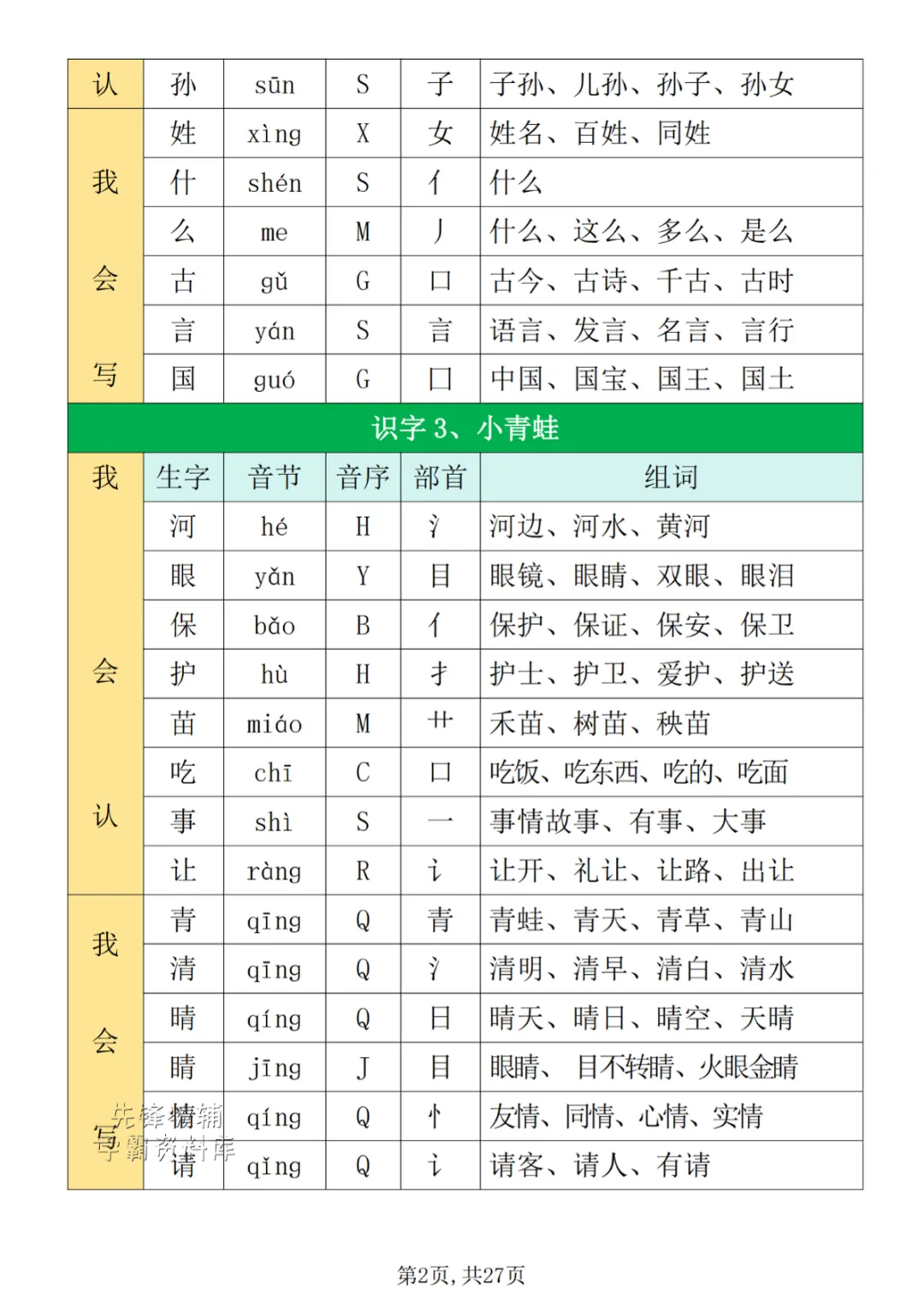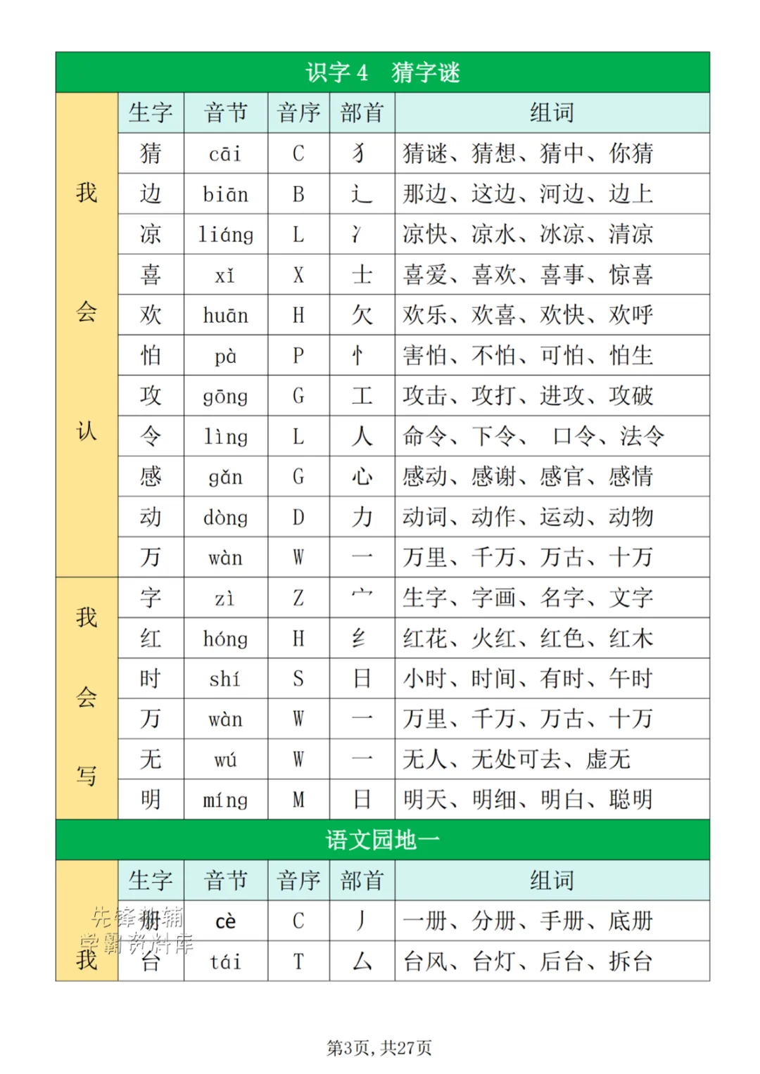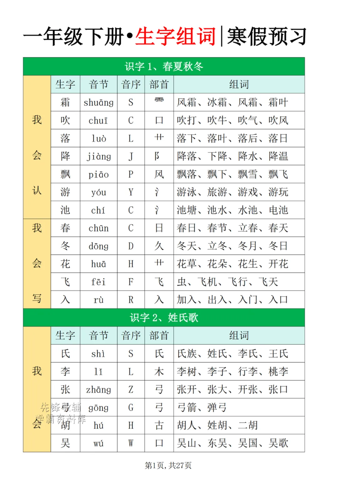 一年级(下)生字组词寒假预习