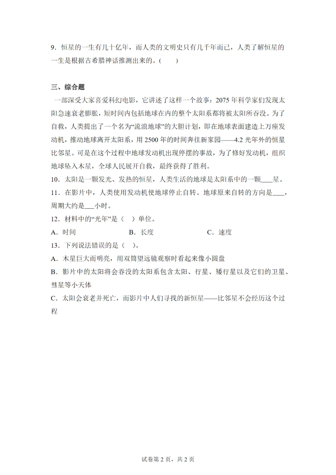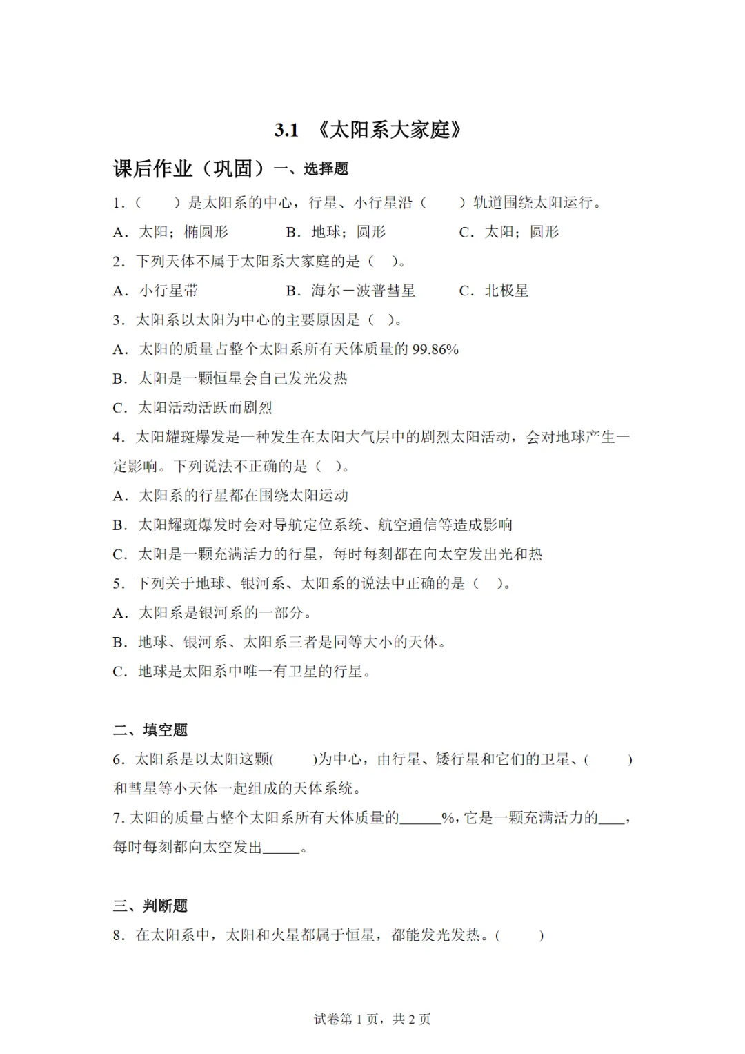 【免费下载】【教科版】新六年级下册科学3.1《太阳系大家庭》课后作业(巩固),可打印