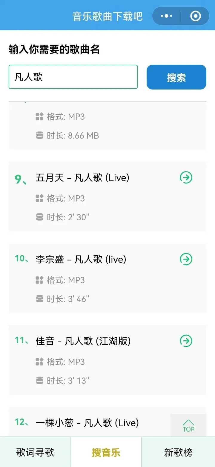 点击进入小程序,在小程序主页面输入框里输入自己想要下载的歌曲,输入完成后点击搜索,就可以进行歌曲搜索了。搜索到想要下载的歌曲,选择相应的歌手进行选择下载音乐就行。下图以李宗盛的歌曲《凡人歌》为例进行演示: