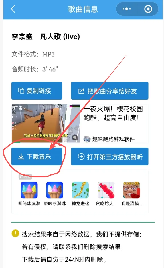 如果在下载过程中可能会出现观看广告30秒提示,或者提示防止利用小程序恶意下载的提示,广告可以看,如果让填写音乐下载码,直接填写520即可解决问题。