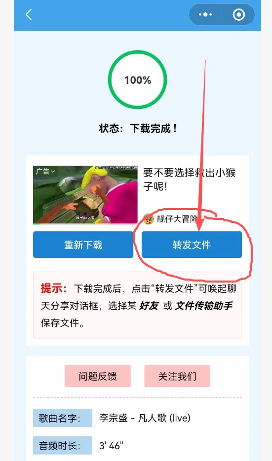 在页面里点击下图圆圈中的下载音乐进行下载,下载完成后,选择转发文件,将文件转发到微信好友或者文件传输助手后,在微信聊天里就可以下载到手机里或者电脑上啦。