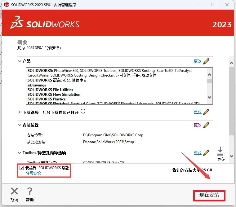 18.点击“安装位置”后的“更改”选择软件安装路径。这里注意一下大小,主程序一般是7个G左右,如果过小或者过大,点一下产品右侧的蓝色字体【更改】,然后选择solidworks主程序还有语言里的简体中文,这样才是正常的安装。