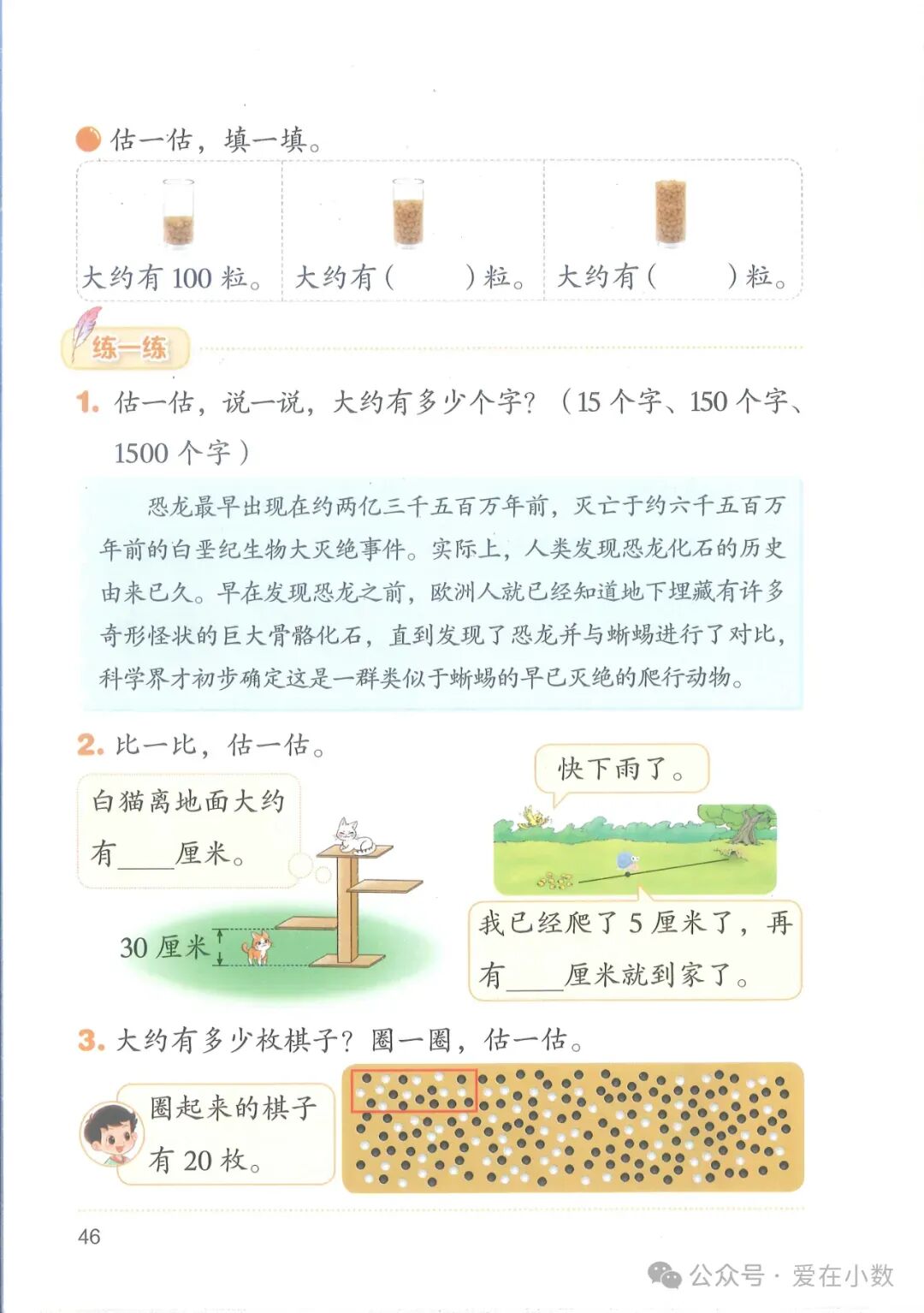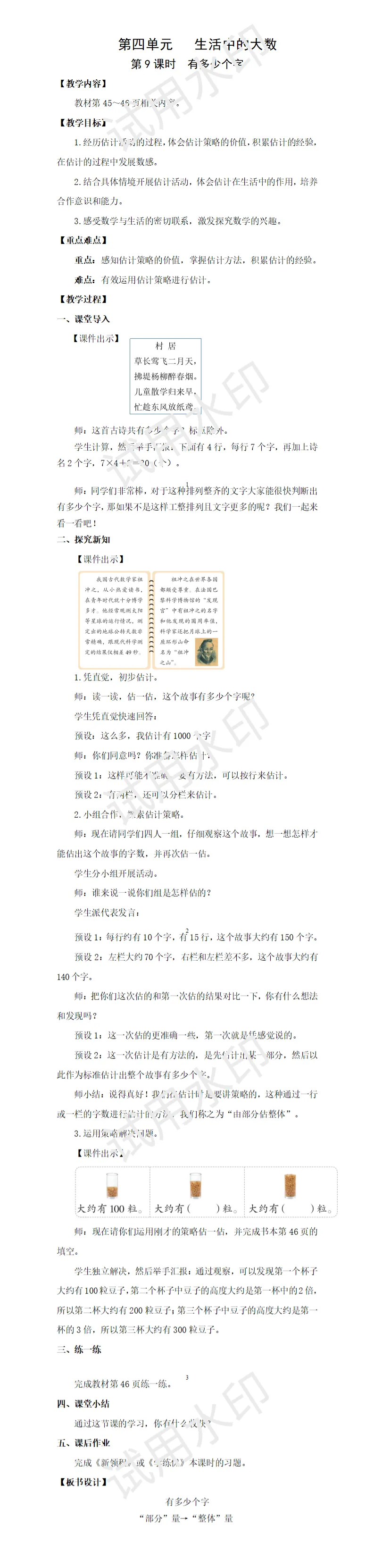 这是第一次安排独立课时学习估计,对于学生而言有一定的难度。因此,在引出情境后,先让学生凭直觉快速说出答案,然后组织学生开展小组活动,探索估计的策略并再次估计,让学生在汇报、交流、对比的过程中明确可以由“部分”量估计出“整体”量,体会估计策略的价值,进一步发展数感。通过课堂练习,发现少部分学生还是不能很好地找到标准,这在后续的学习中要持续关注。