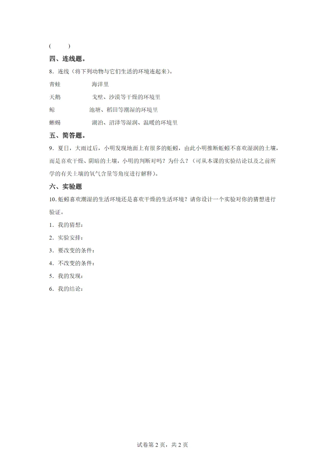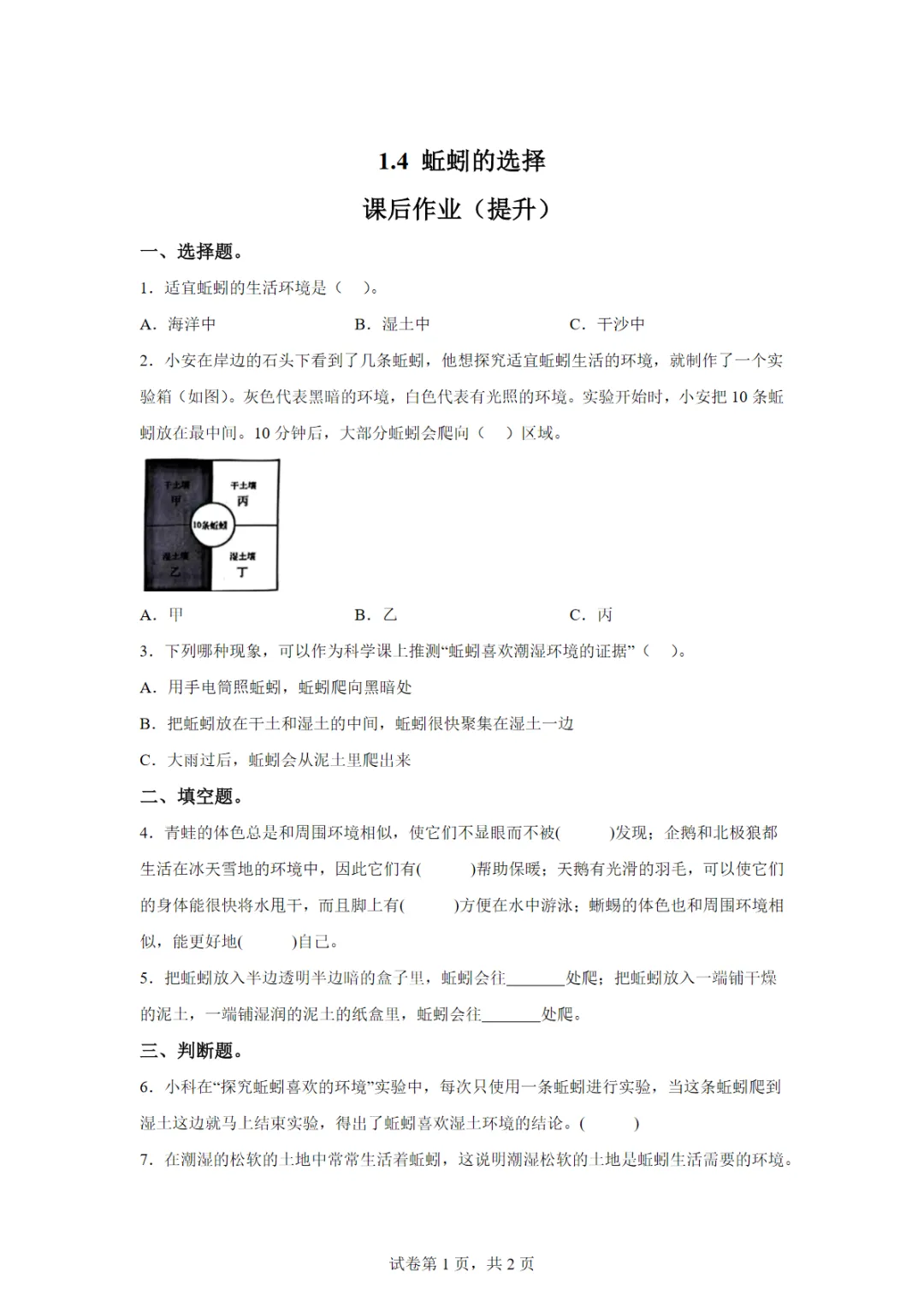 【免费下载】【教科版】新五年级下册科学1.4 蚯蚓的选择课后作业(提升),可打印
