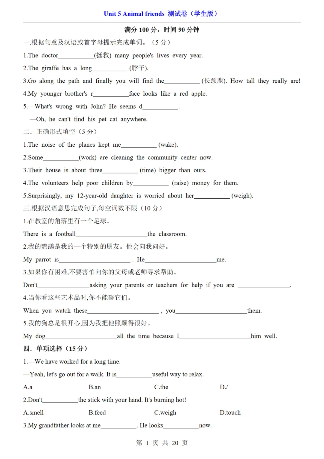 【免费下载】七年级(下)英语Unit5 测试卷(译林版),PDF电子版,可打印
