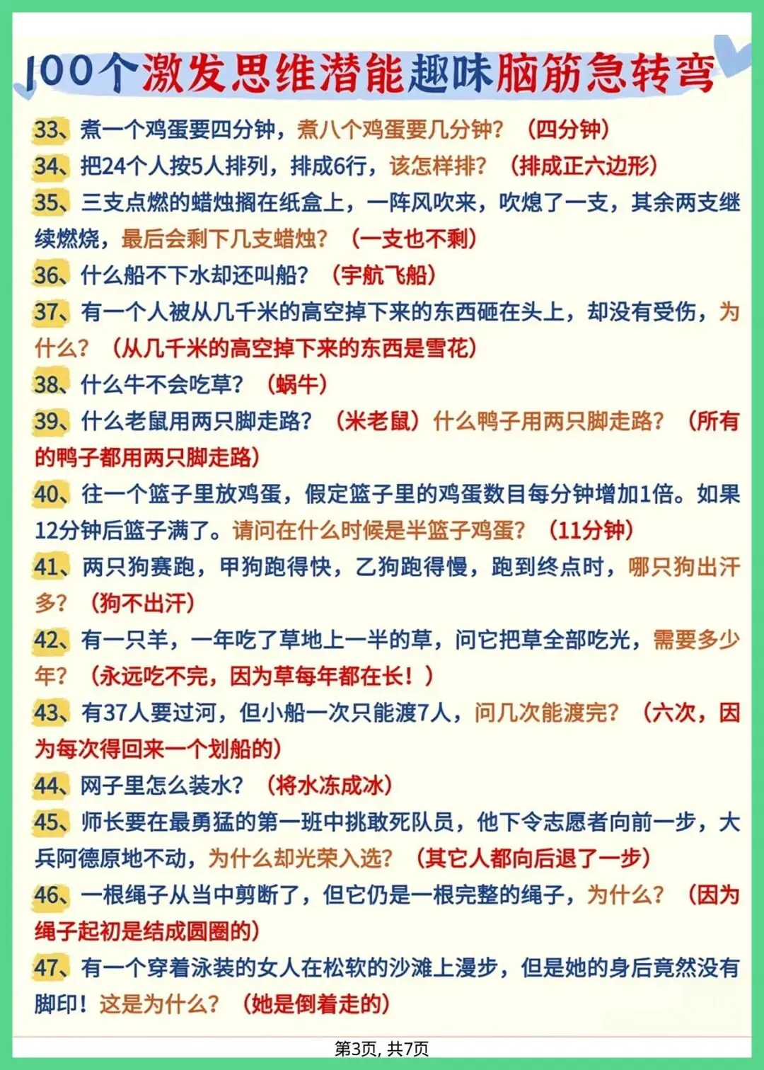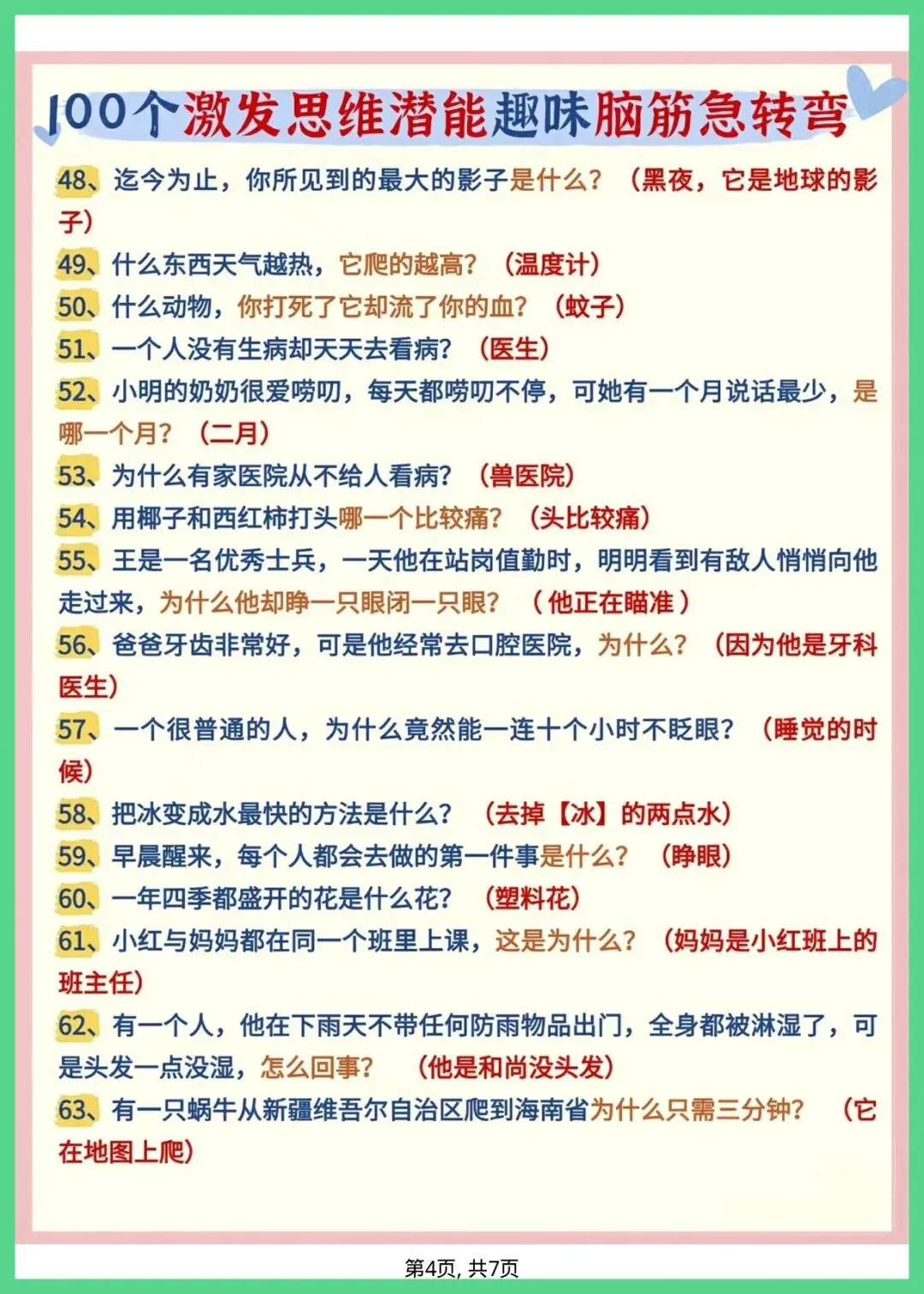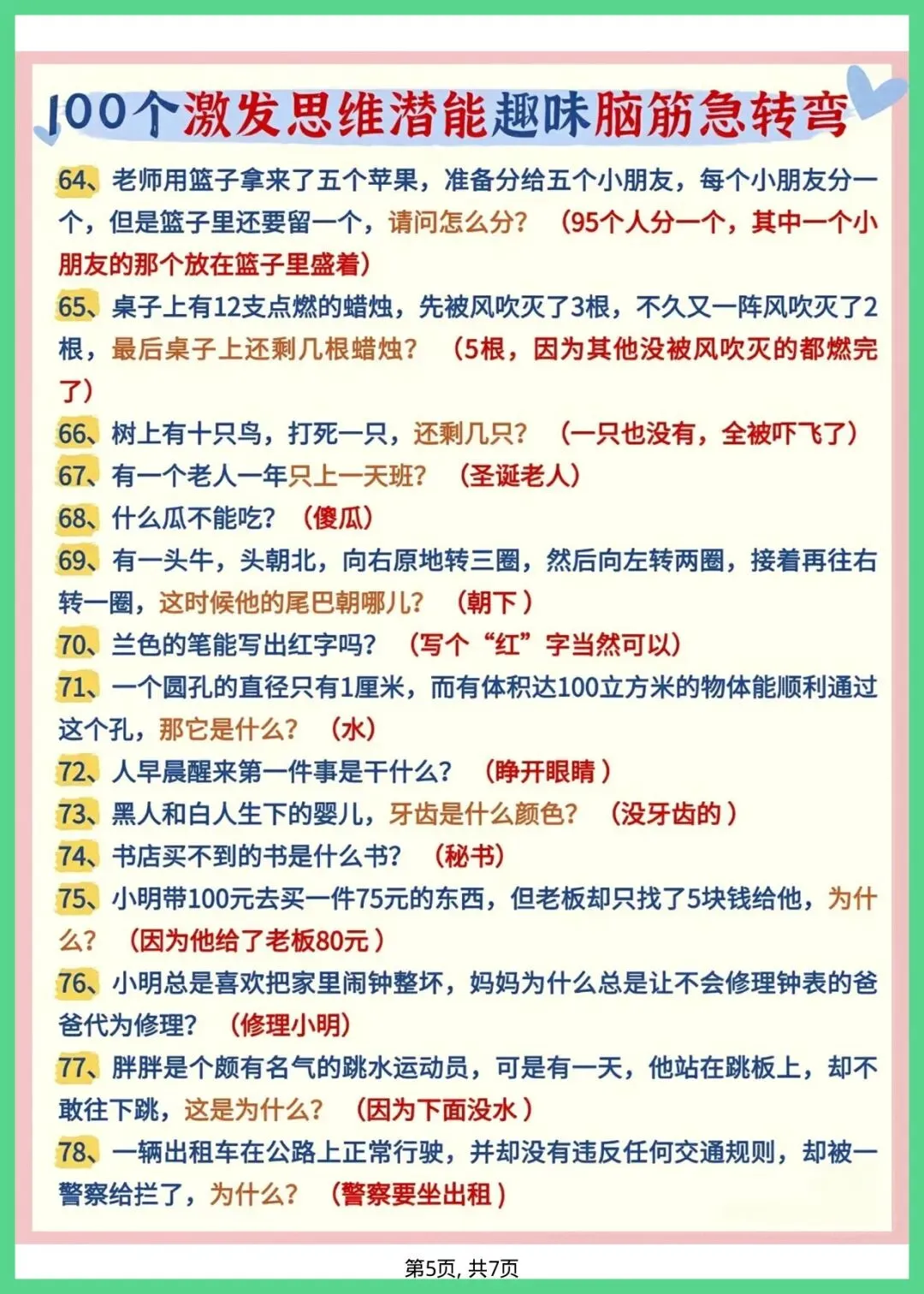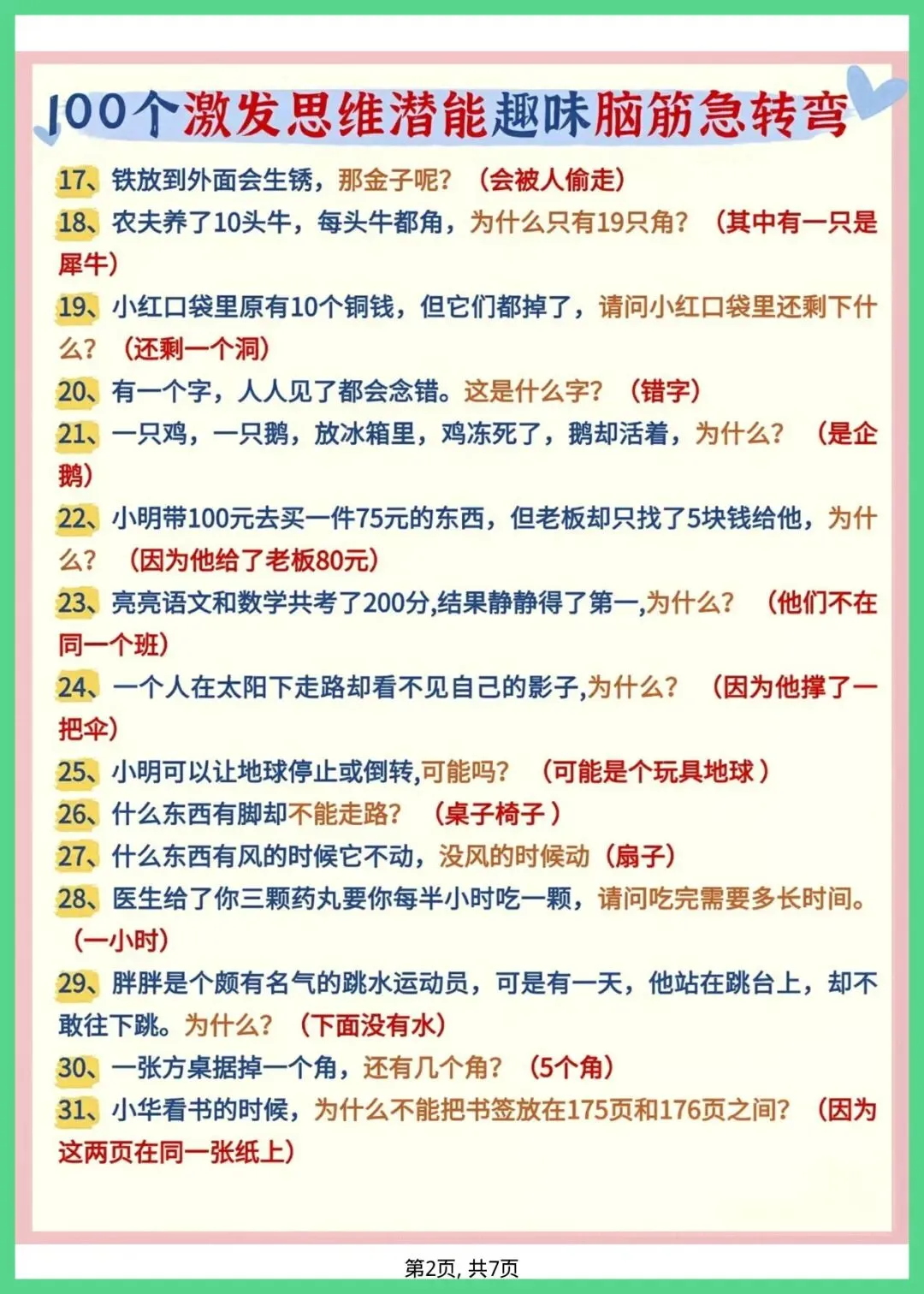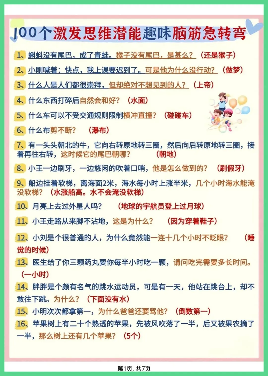 幼小衔接语文_趣味脑筋急转弯,共7页,电子版可打印可下载。这份资料内容丰富,结构清晰,包含了核心知识点和练习题,帮助孩子巩固学习成果,及时发现不足之处,查缺补漏。有需要的家长抓紧打印出来给孩子练一练吧!