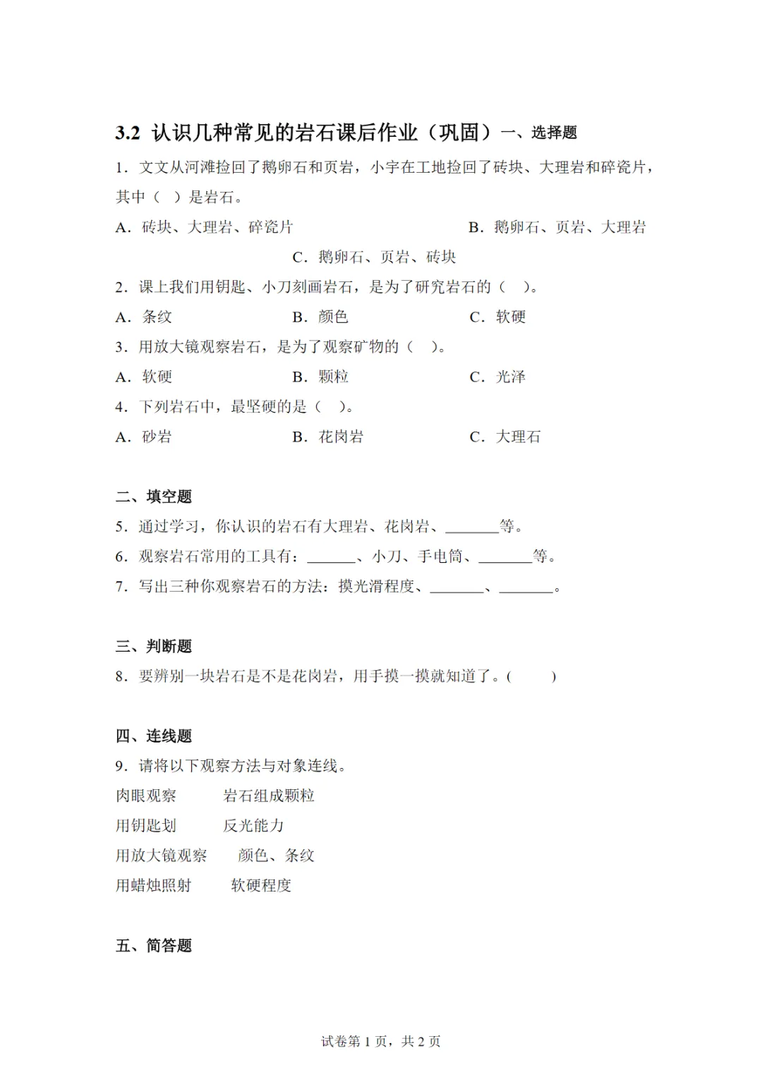 【免费下载】【教科版】新四年级下册科学3.2认识几种常见的岩石课后作业(巩固),可打印