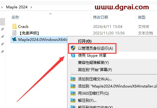 2、选择【Maple2024.0WindowsX64Installer.exe】鼠标右键以管理员身份运行