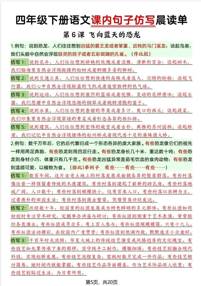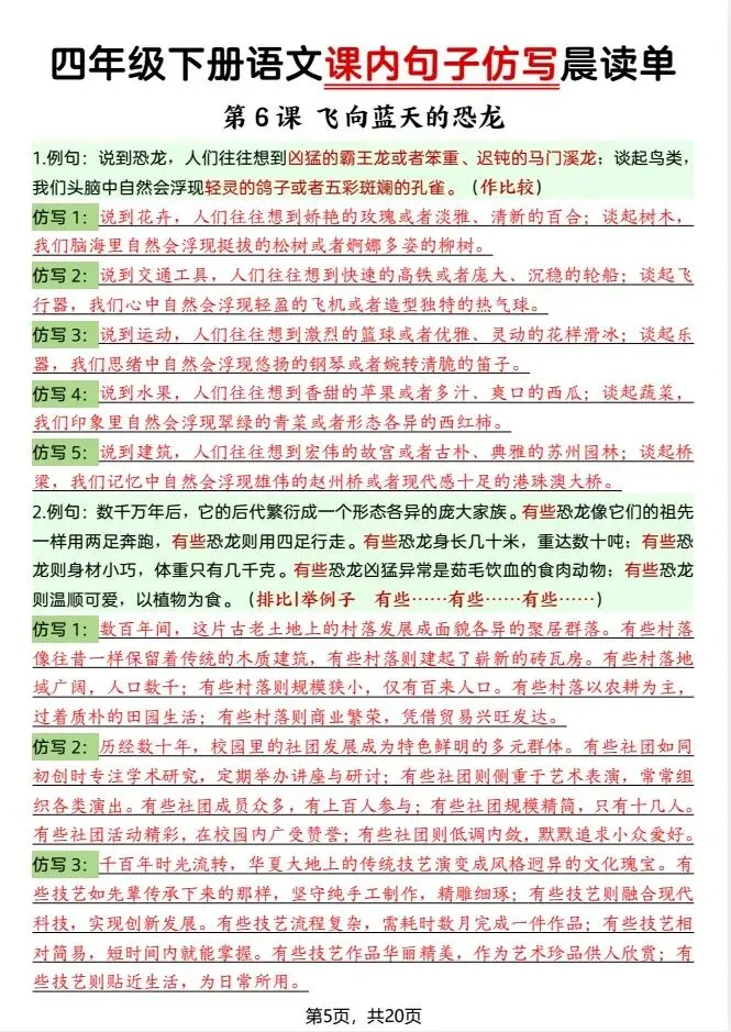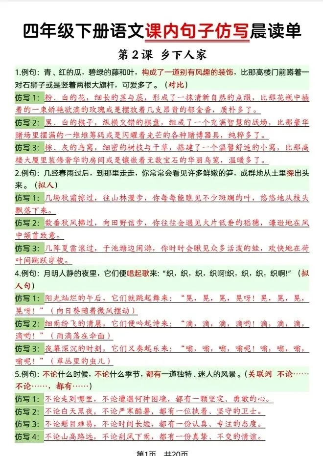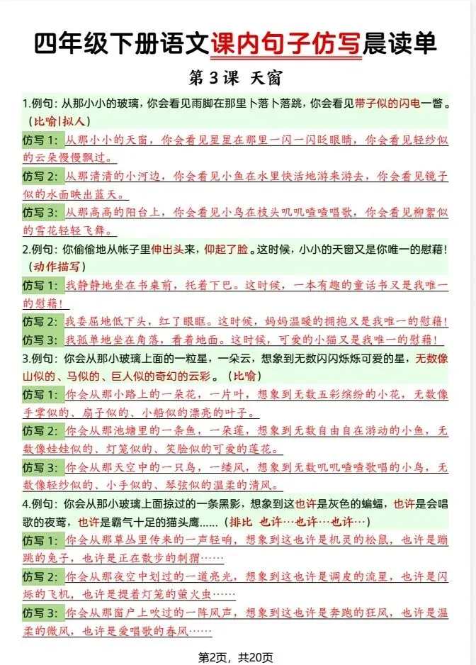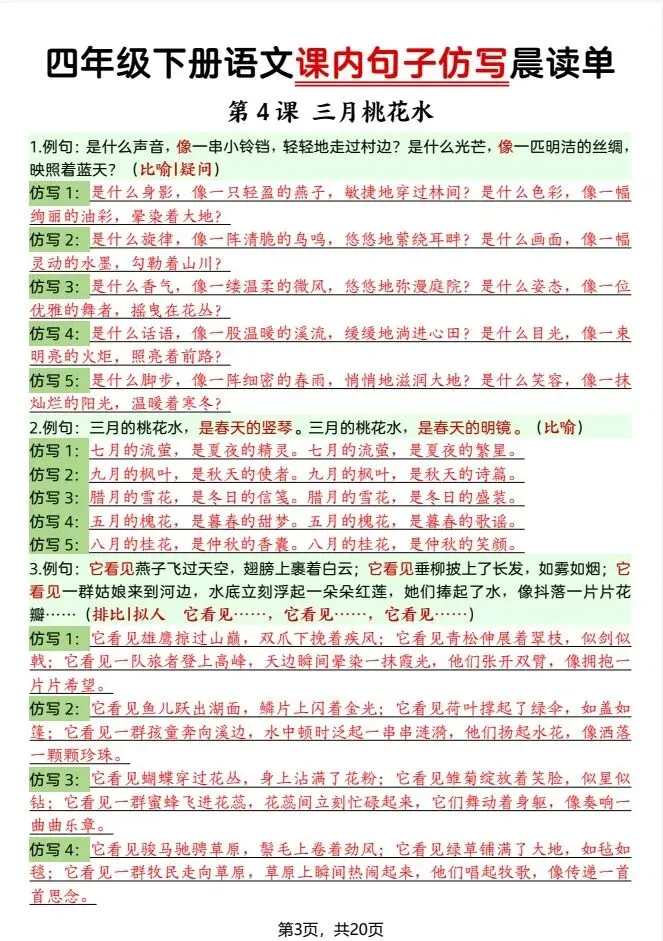 今天给大家整理了四年级下册语文课内句子仿写晨读单,转发给朋友或班级群,受益更多人,帮助孩子学习!
