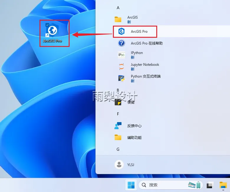 26.点击【开始】>【所有应用】>【ArcGIS Pro】左键按住拖到桌面