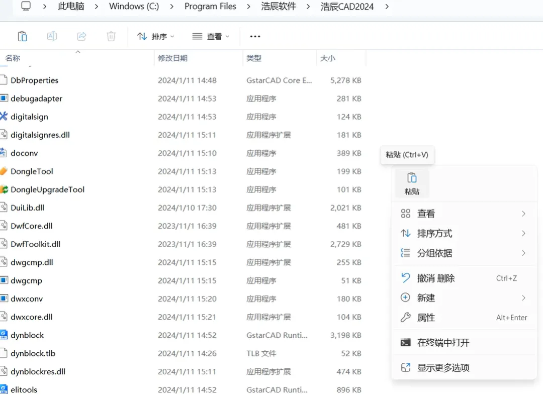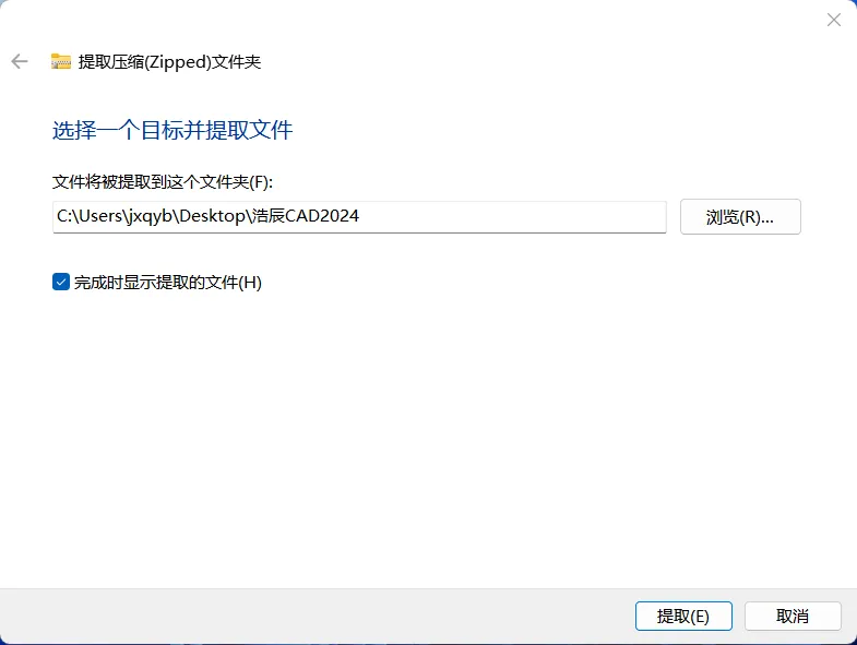 2.1,鼠标右击【浩辰CAD2024】压缩包(Win11系统需先点击“显示更多选项”)选择【全部解压缩】。如下图:
