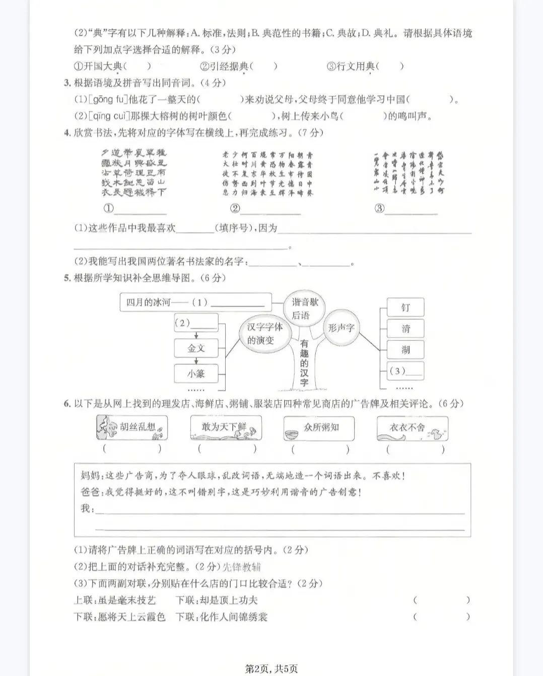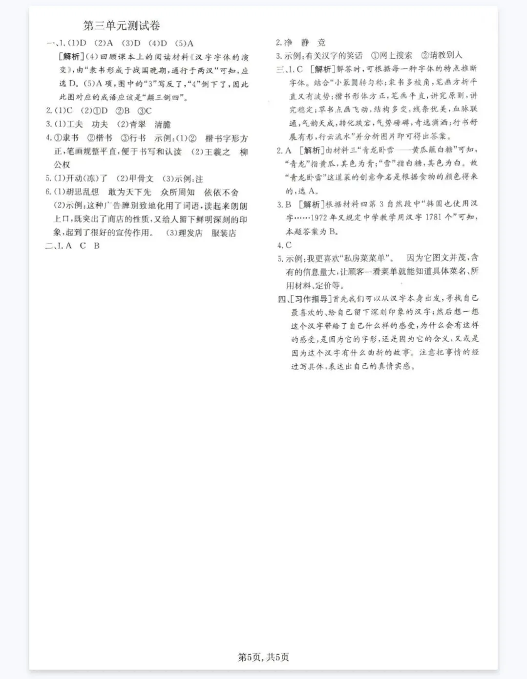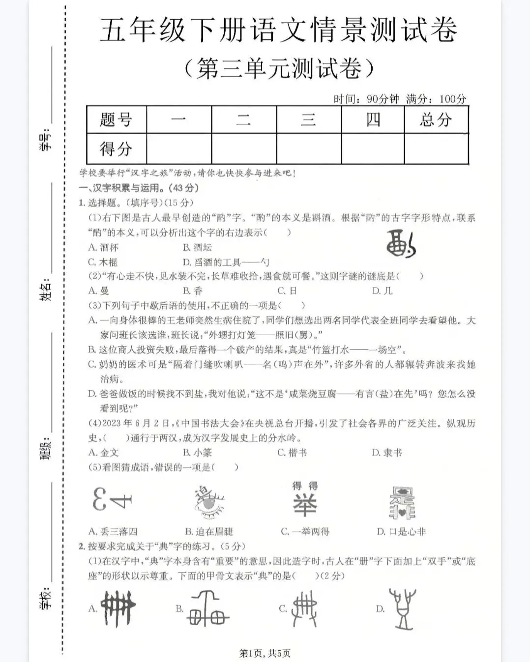 >(文末免费下载)五下语文第三单元检测练习测评综合素质评价卷