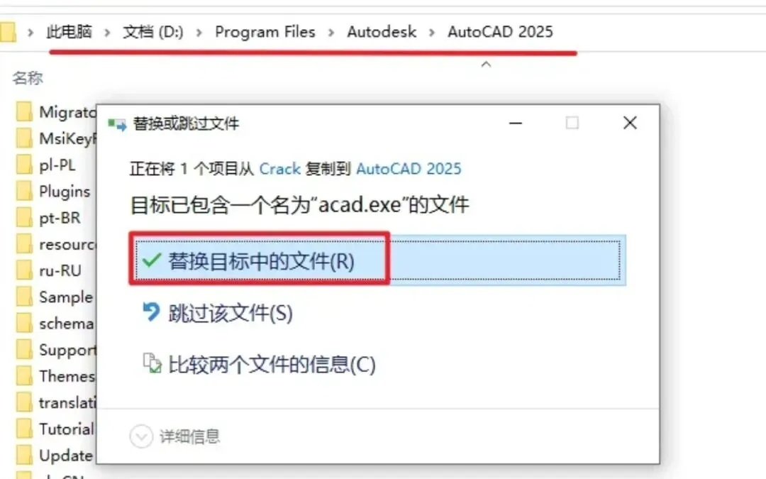 🔹复制acad文件,粘贴到软件安装路径,选择“替换目标中的文件”
