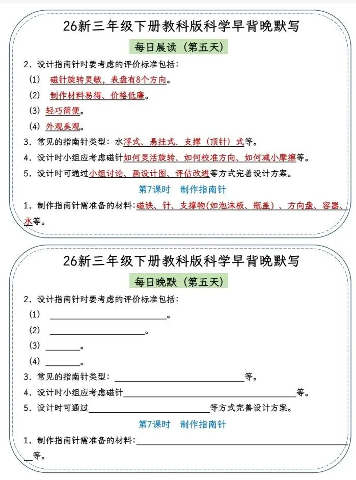 文末免费下载|26春三年级科学下册《早读晚默 小纸条》教科版