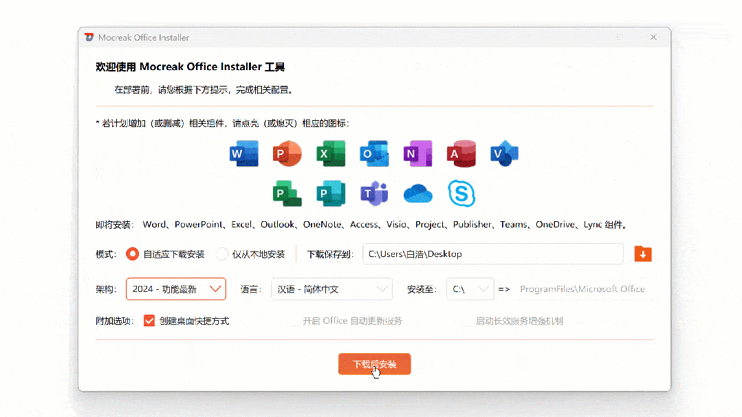 全部设置好后,只需要点击最底部的下载后安装按钮,就会调用官方下载接口开始全自动下载安装office!