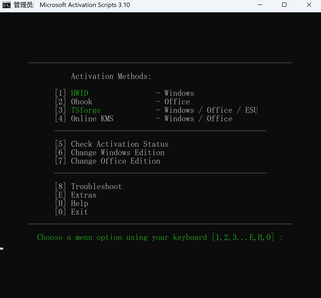 我们只需要下载后,用管理员权限运行,然后输入3以TSforge方式回车,然后再输入个3进行激活即可!