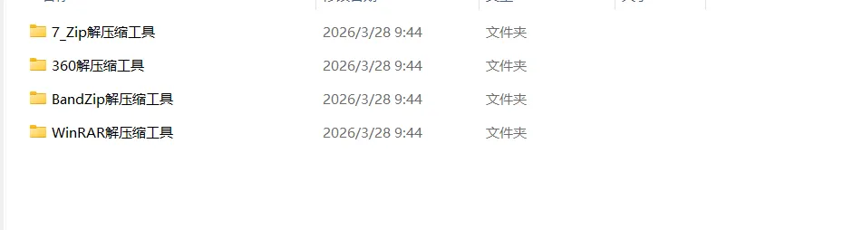 这份解压工具合集,帮你一次性搞定 Windows 端的主流压缩软件,解决格式不兼容、解压慢、弹窗广告等痛点。合集包含 4 款工具:开源免费的 7-Zip,以超高压缩比著称,适合追求极致存储效率的用户;360 压缩支持全格式兼容,自带安全检测,小白也能轻松上手;BandZip 主打无广告高速解压,批量处理文件表现亮眼;经典老牌 WinRAR,对 RAR 格式的兼容性和稳定性拉满,是办公场景的稳妥选择。不同工具各有优势,按需取用即可,轻松应对日常办公、文件备份、特殊格式解压等各类需求,告别单一工具的局限性。