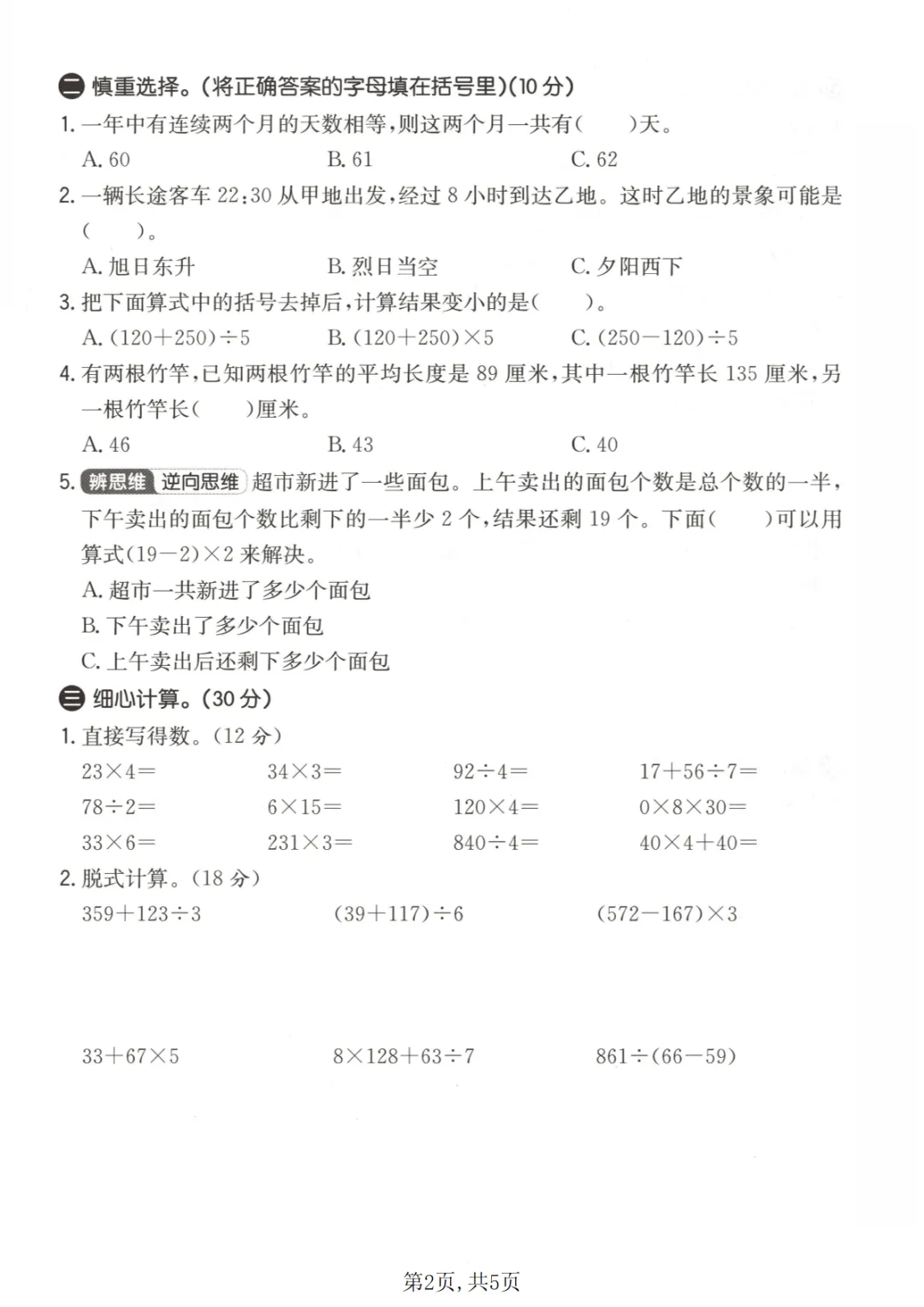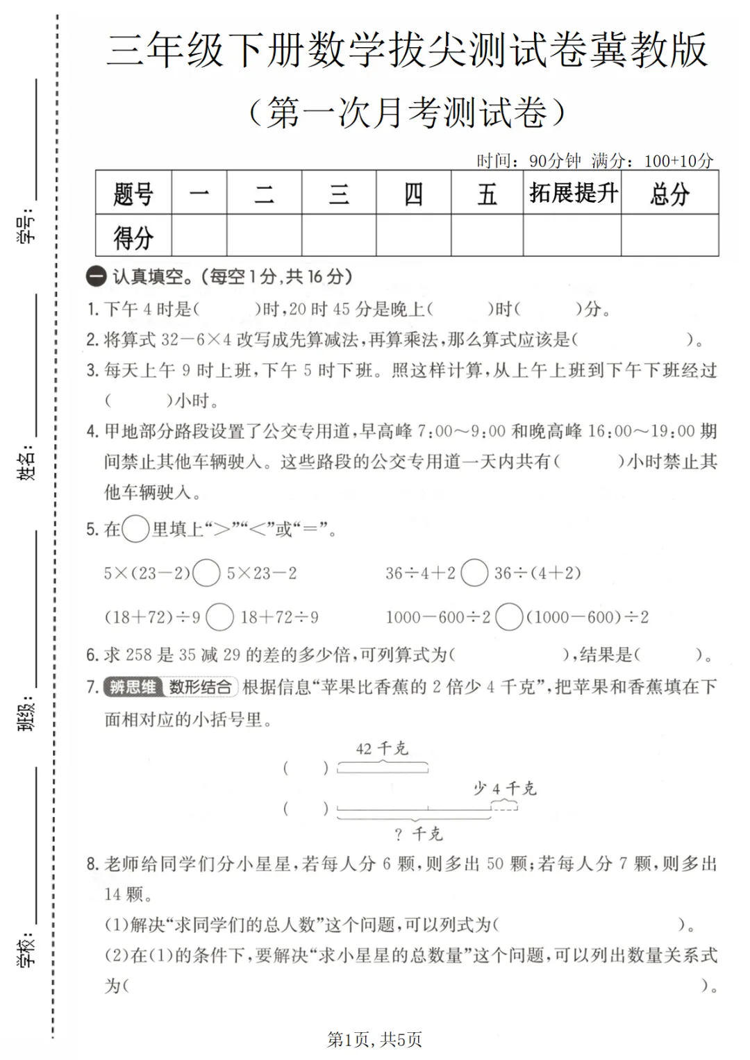 【免费下载】三年级(下)数学 第一次月考拔尖测试卷《冀教版》,PDF电子版,可打印,共5页,先保存,以免资源失效