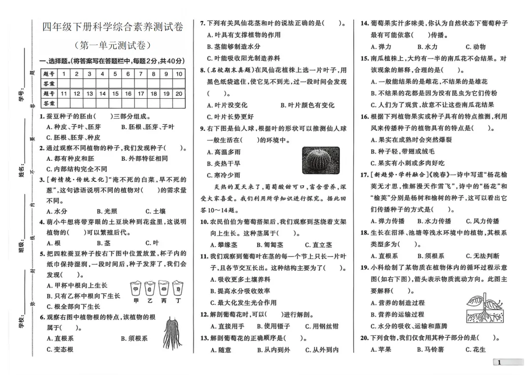【免费下载】四年级(下)科学 第一单元综合素养测试卷《教科版》,PDF电子版,可打印,共3页