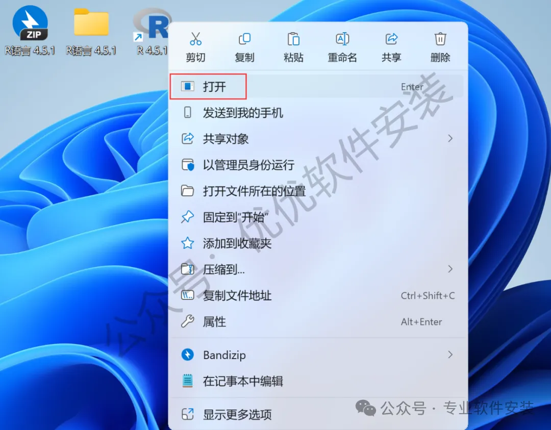 13、回到桌面,右键桌面上的【R 4.5.1软件图标】,点击【打开】