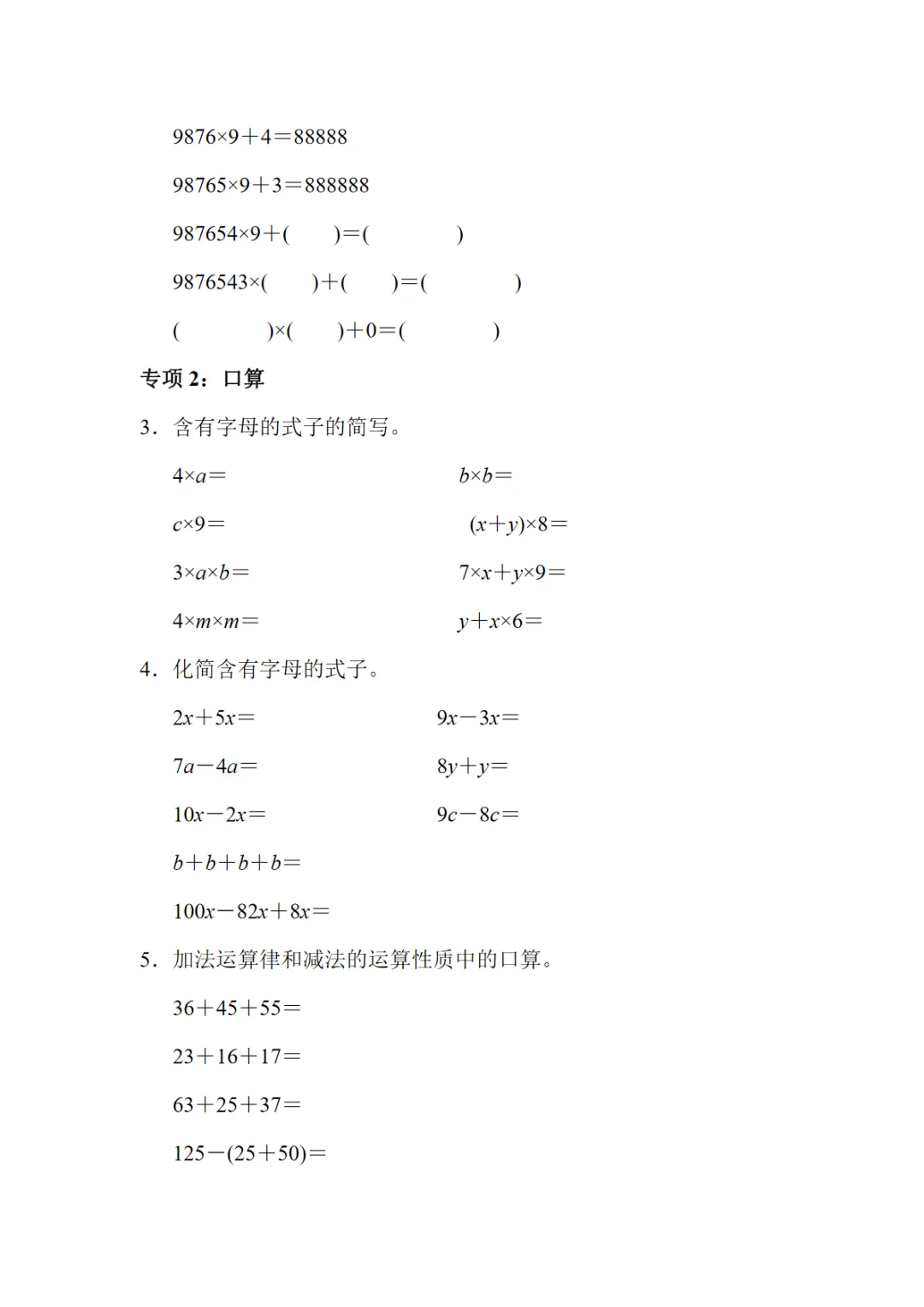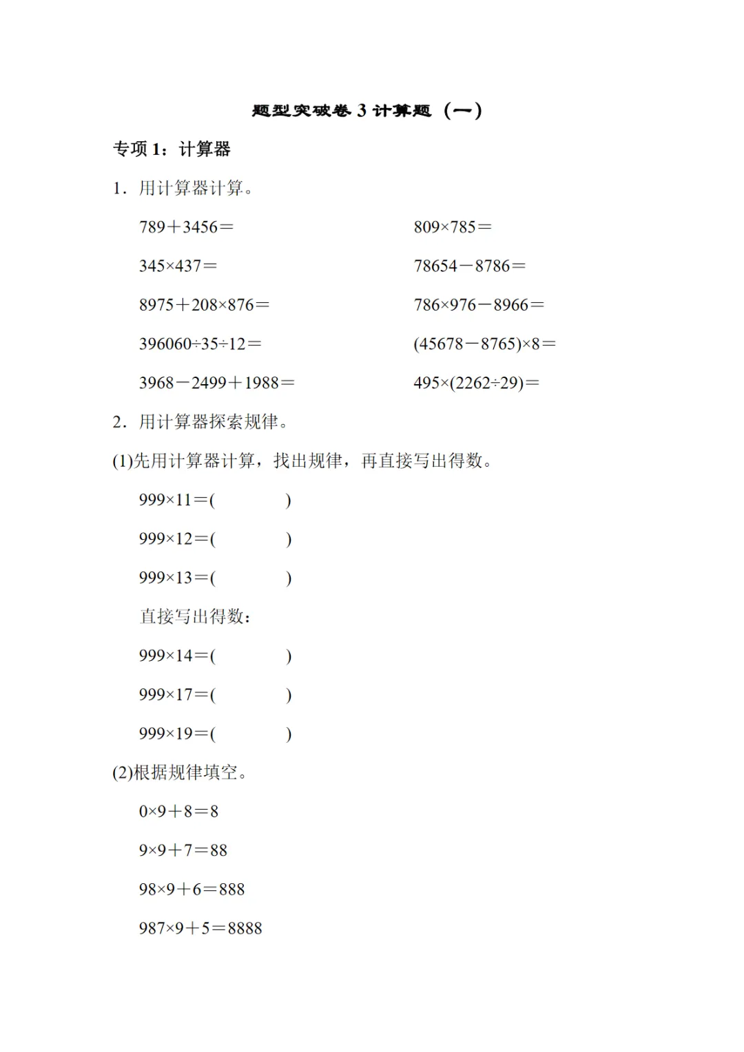 【免费下载】(5)--题型突破卷3 计算题(一)【青岛63】四下数学专项练习题,可打印