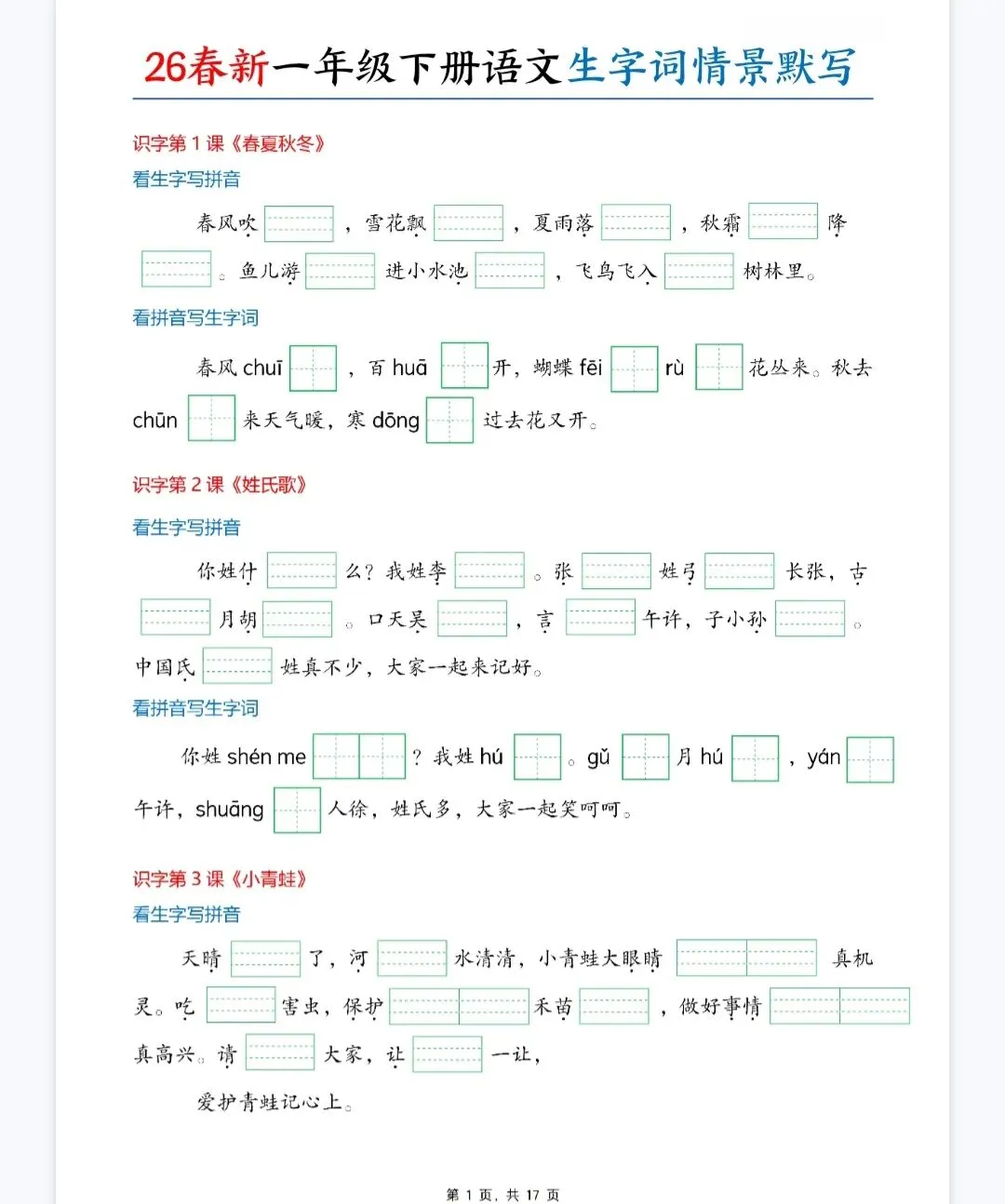今天给大家整理了26春新一下语文生字词情境默写(17页),转发给朋友或班级群,受益更多人,帮助孩子学习!