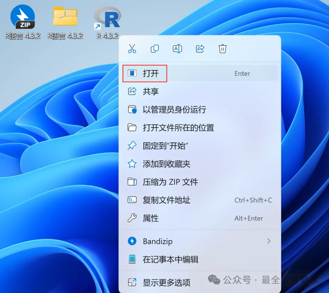 13、回到桌面,右键桌面上的【R 4.3.2软件图标】,点击【打开】
