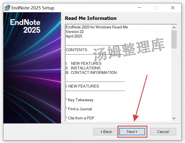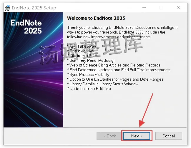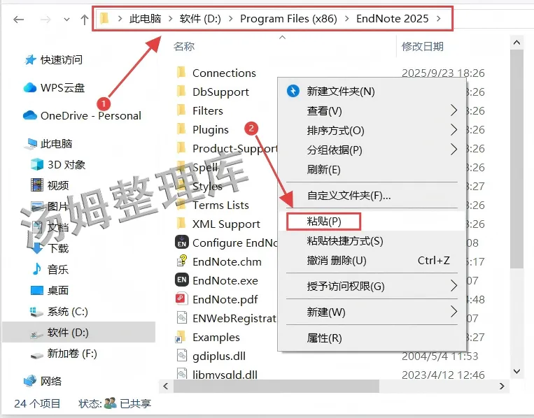 1.解压下载后的压缩包,进入EndNote 2025文件夹。(解压不了,可安装Winrar解压软件)2.选中【Setup】,右键【以管理员身份运行】。4.选择【I would...】再点击【Next】。6.先选择【I accept ...】再点击【Next】。8.点击【Browse...】进行修改EndNote的安装路径。9.可以把地址栏首字符C改为D,代表EndNote将安装到电脑D盘,也可以自定义选择安装路径。(记住自己选择的安装路径,后面激活步骤需要)13.显示EndNote 2025完成后,点击【Finish】。14.回到前面解压好的EndNote 2025文件夹,再打开【Crack】文件夹。(打开Crack文件夹如没有东西,则是解压没退出杀毒和系统防火墙被拦截删除了,退出重新解压即可恢复)15.全选这四个文件,鼠标右键点击【复制】。(必须是四个文件,缺一不可,数量不对就是解压被拦截删除了)16.找到Endnote的安装目录(步骤10选择的安装路径文件夹),鼠标移在空白处右键进行【粘贴】。18.选中复制过来的【汉化补丁】,右键选择【以管理员身份运行】。19.等待一会,弹窗显示【OK】就代表EndNote汉化成功,然后点击【X】关闭窗口即可。(运行没反应,请检查有没安装有其他版本,卸载干净或者关闭杀毒和系统防火墙后重新尝试)20.双击桌面【EndNote汉化版】快捷方式图标,启动软件。21.选择【我接受...】再点击【下一步】。(没有就忽略)22.点击【Create a new library】。23.选择保存文档的位置,根据自己需求保存到任何位置都行。24.Endnote 2025就安装完成了,可以正常使用!一、安装失败的典型原因与解决方法