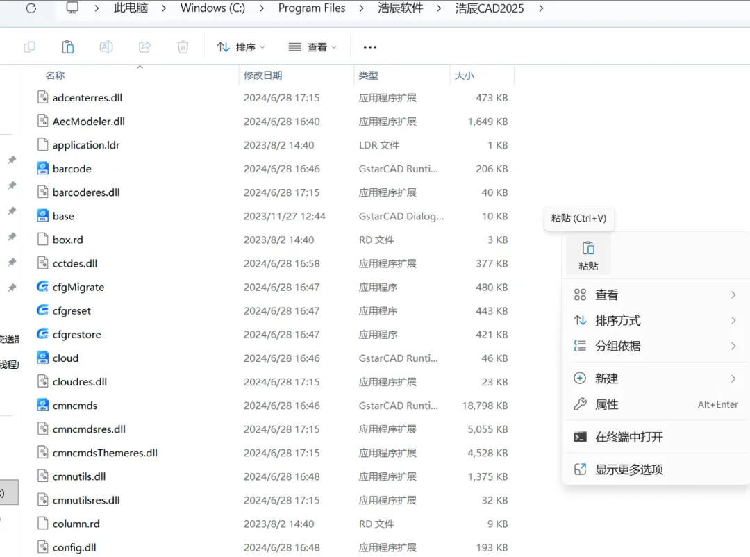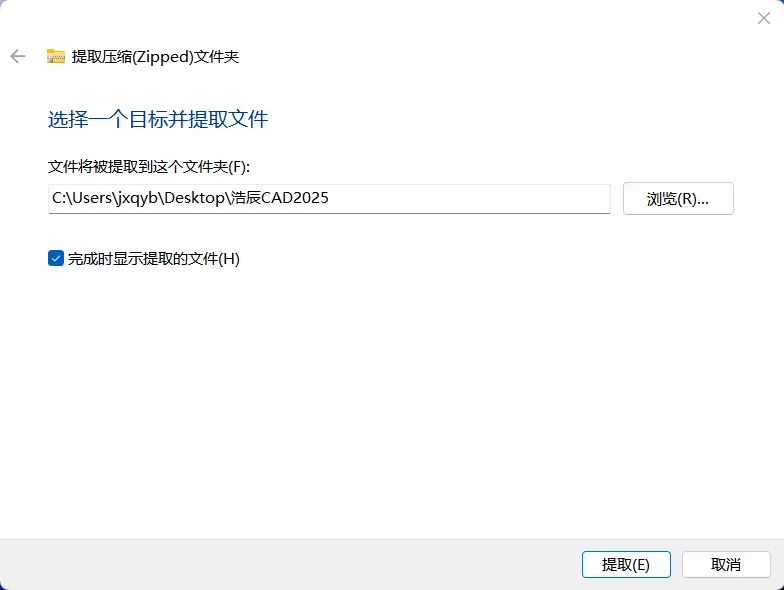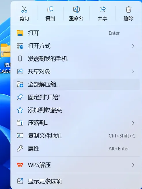 2.1,鼠标右击【浩辰CAD2025】压缩包(Win11系统需先点击“显示更多选项”)选择【全部解压缩】。如下图: