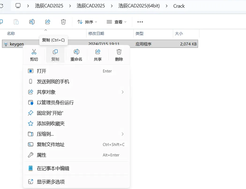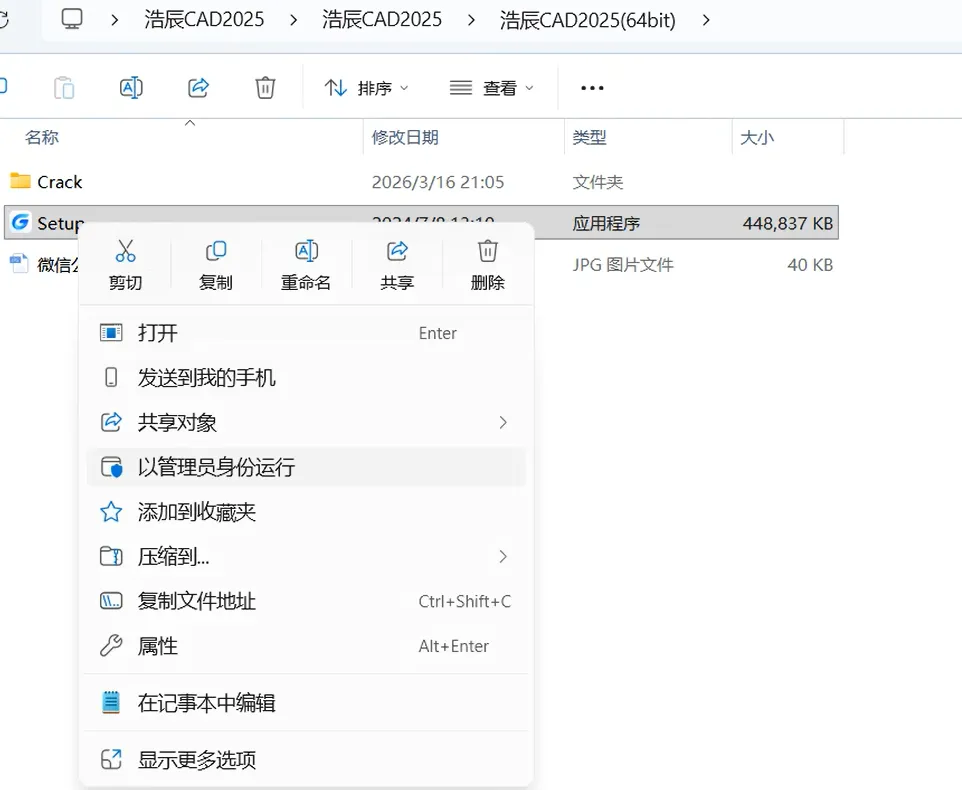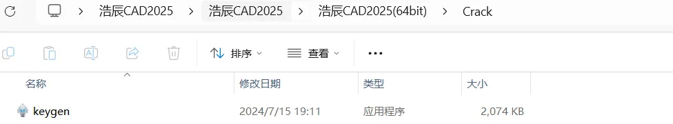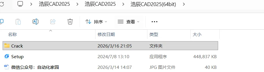 2.11,打开解压后的文件夹,双击打开【浩辰CAD2025】->【浩辰CAD2025】->【浩辰CAD2025(64bit)】->【Crack】文件夹。