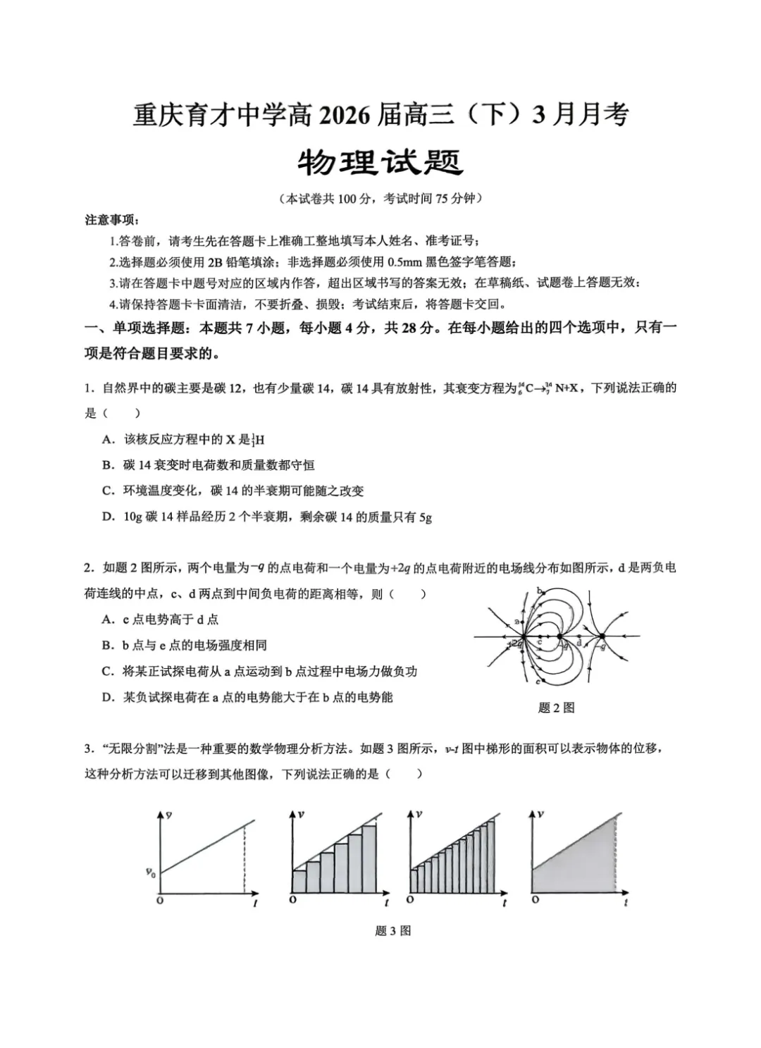 2026 届重庆育才中学高三年级下学期3月(月考)物理试卷及答案