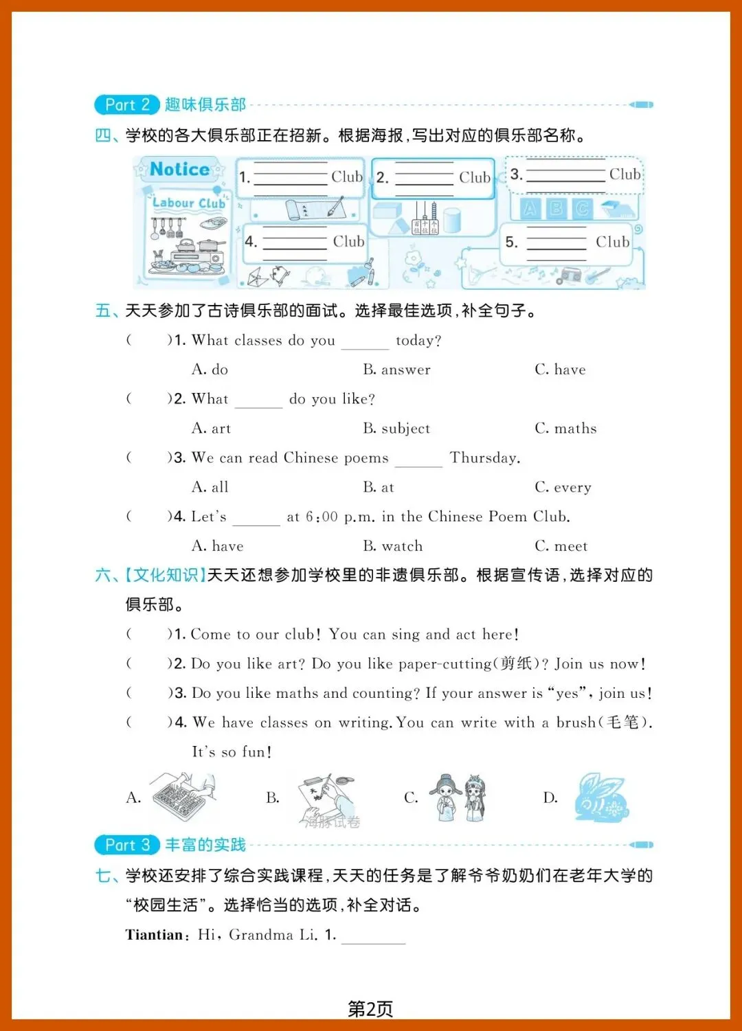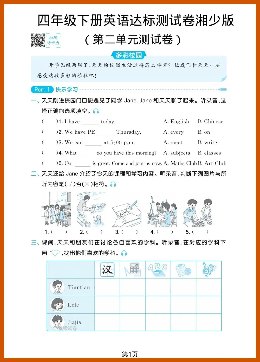 四年级(下)英语_第二单元达标测试卷《湘少版》,共4页,电子版可打印可下载。这份资料内容丰富,结构清晰,包含了核心知识点和练习题,帮助孩子巩固学习成果,及时发现不足之处,查缺补漏。有需要的家长抓紧打印出来给孩子练一练吧!