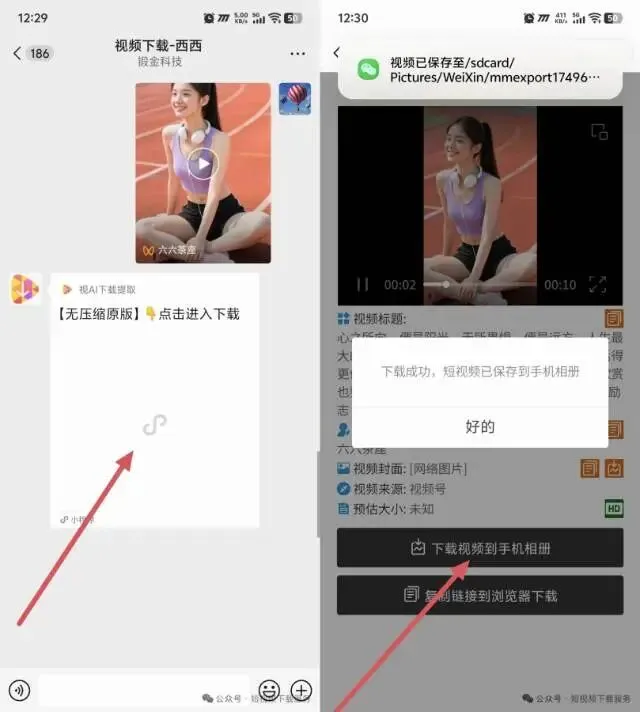 ② 视频下载客服机器人会自动解析并返回下载小程序,进入小程序就可以一键下载到手机相册了!
