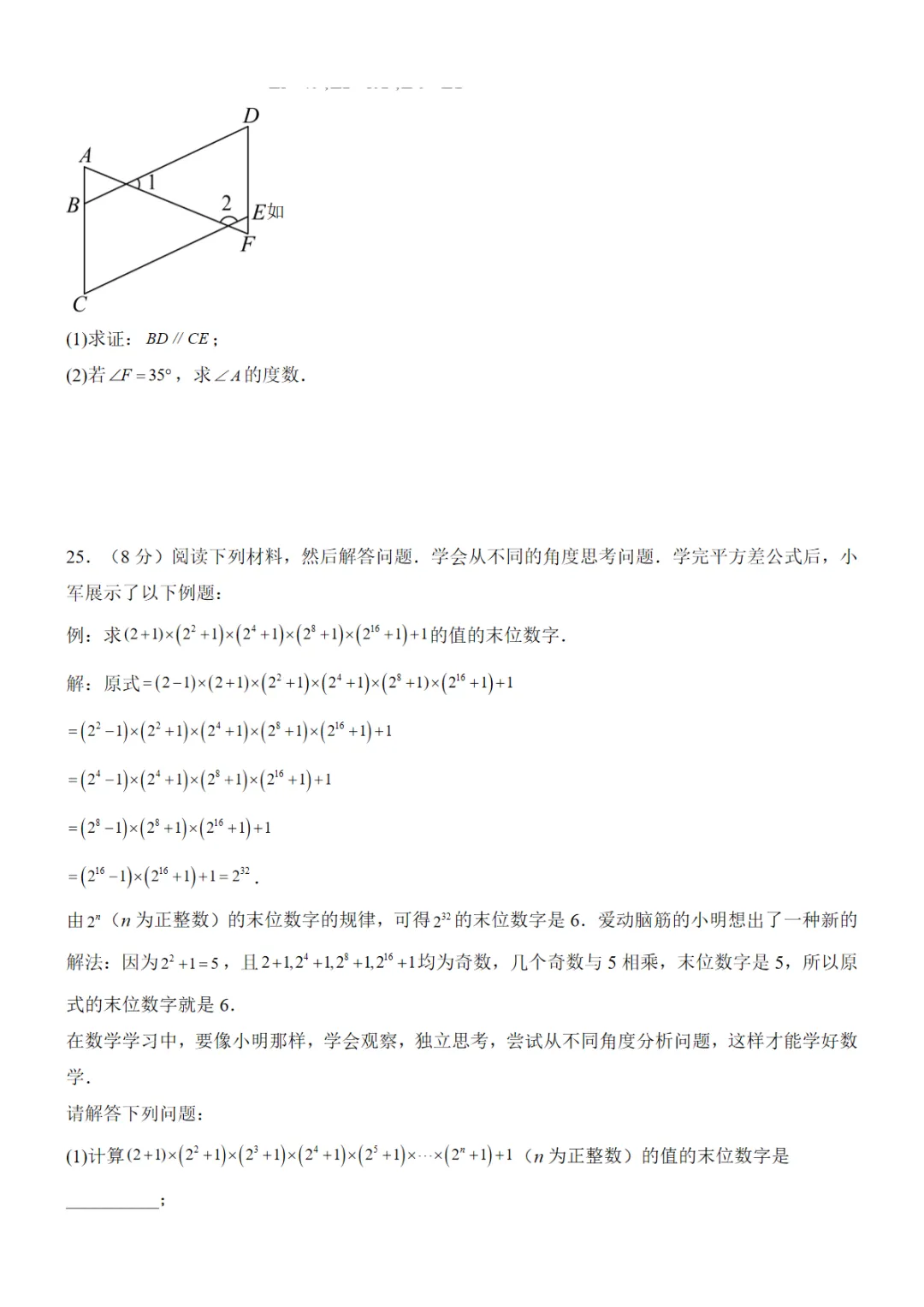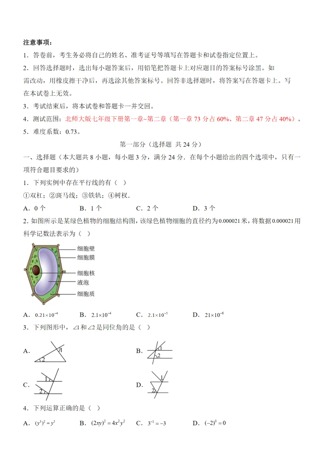 【北师】7下数学第1次月考01【第1-2章】