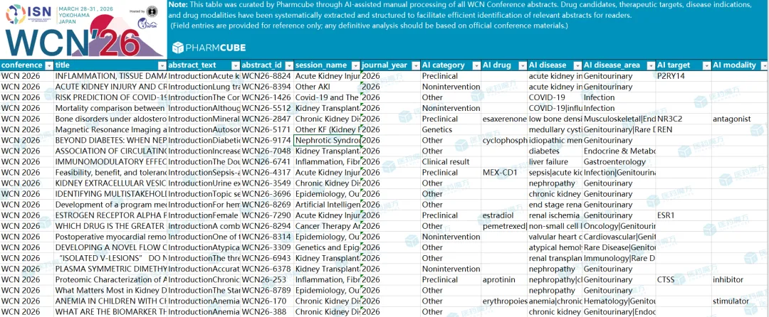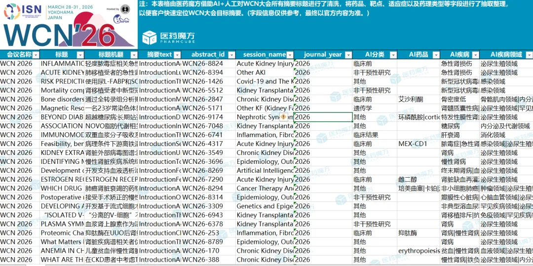 近日,WCN官方公布了本次大会摘要内容。医药魔方对本届大会超2500条摘要内容数据进行了整合清洗,借助AI抽取了每条摘要涉及的药品、靶点、机构、适应症以及药理类型等关键字段,汇总形成了WCN摘要数据合集(提供中英双语版本)。