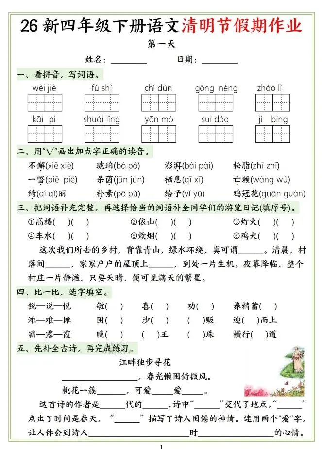 今天给大家整理了26新四年级下册语文清明节假期作业,转发给朋友或班级群,受益更多人,帮助孩子学习!