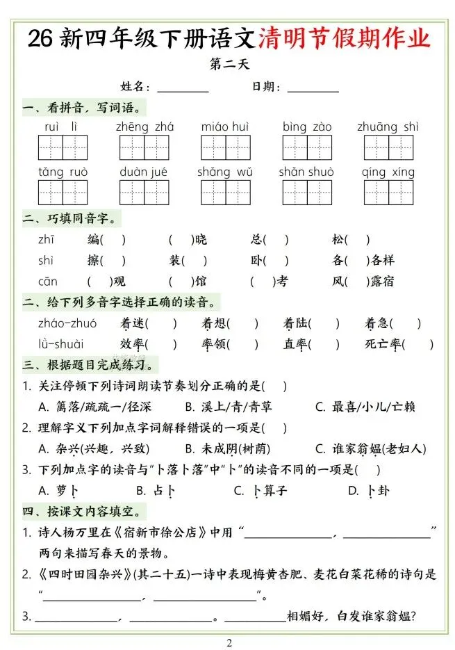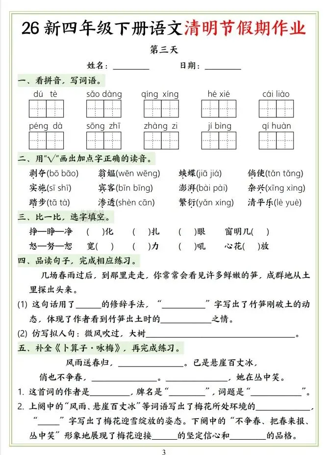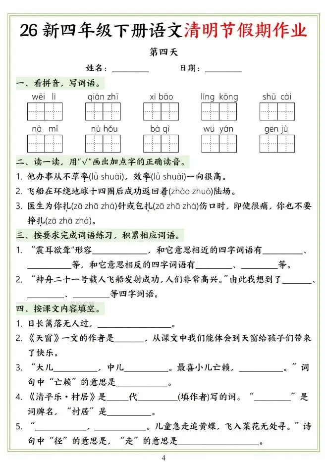 文末免费下载|26新四年级下册语文清明节假期作业(附答案)