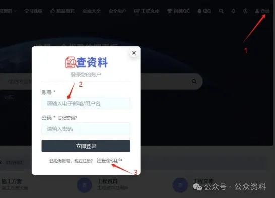 输入网址登陆站点之后,点击“1”右上角登录,然后弹出“2”登录窗口,输入帐号密码即可登陆,还没有帐号点击“3”先注册新用户。