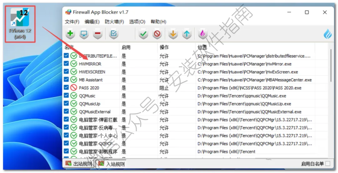 22、点击“入站规则”,将EViews 12 (x64)程序直接拖动到程序界面中