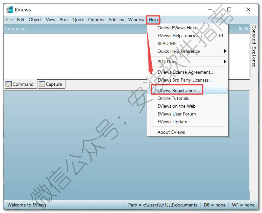 24、点击顶部菜单栏“Help“,点击“EViews Registration...“