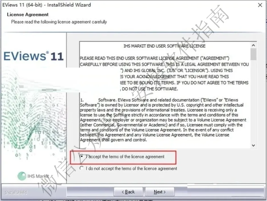 2.双击运行"EViews11Installer(64-bit).exe"程序,进入软件安装向导,选择"I accept..."接受软件安装协议,按默认目录进行安装;