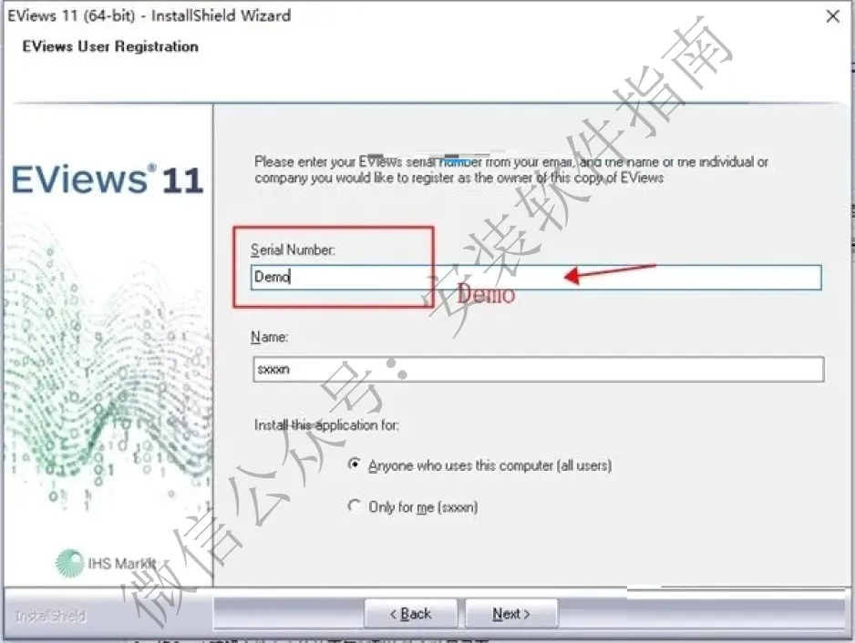 3、这里在Serial Number输入Demo,Name随意输入即可进行下一步;