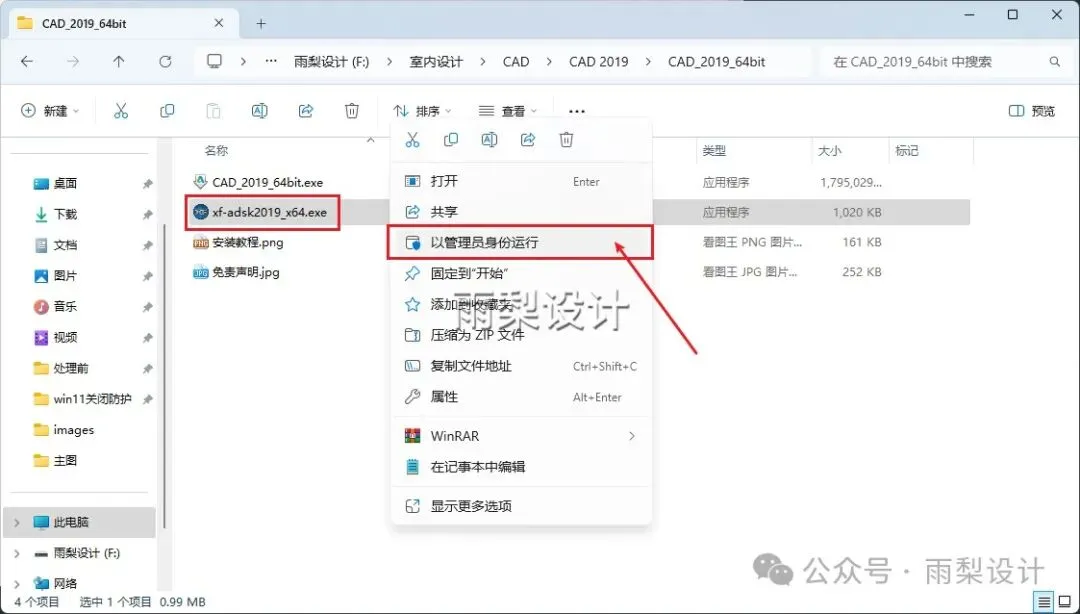 19.返回安装包;右键【xf-adsk2019_x64.exe】选择【以管理员身份运行】