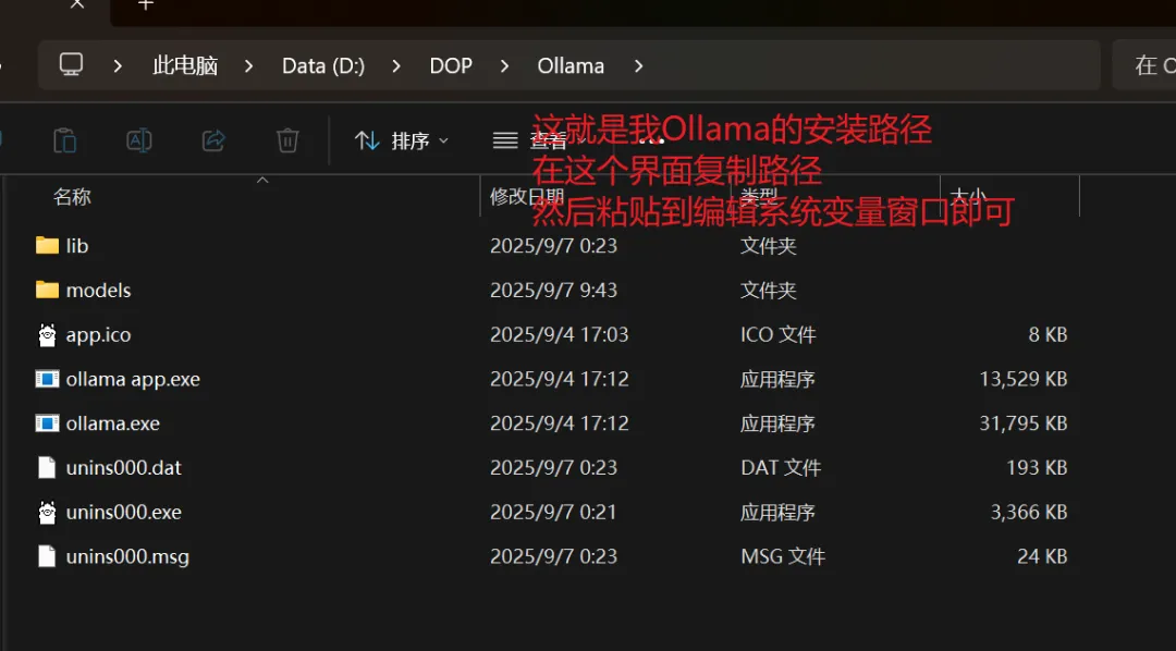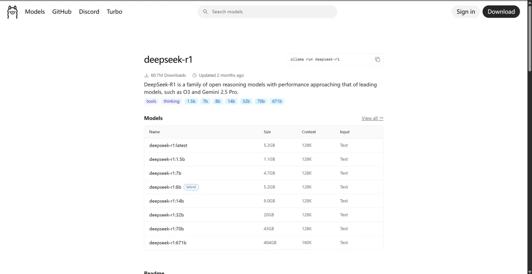 根据自己电脑显存的大小选择合适的参数。这里我选择7b,点击 deepseek-r1:7b ,并复制指令。