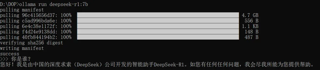 安装好后就直接可以进行对话了,以后也可以通过该指令访问已经下载好的模型。