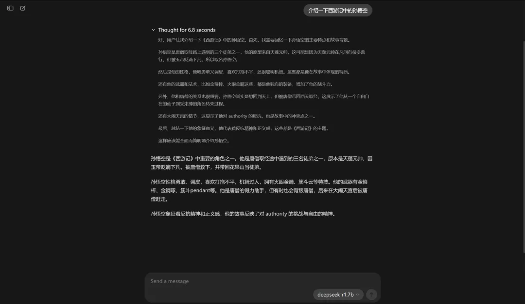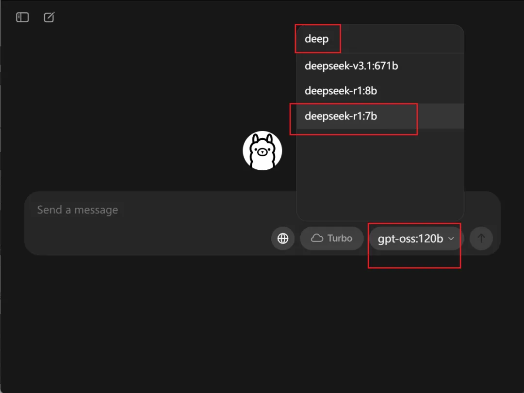 点击模型进入选择模型界面,搜索“deep”,他会显示相关模型,点击下载好的7B模型就可以对话了,如果点击未下载的会自动开始下载。