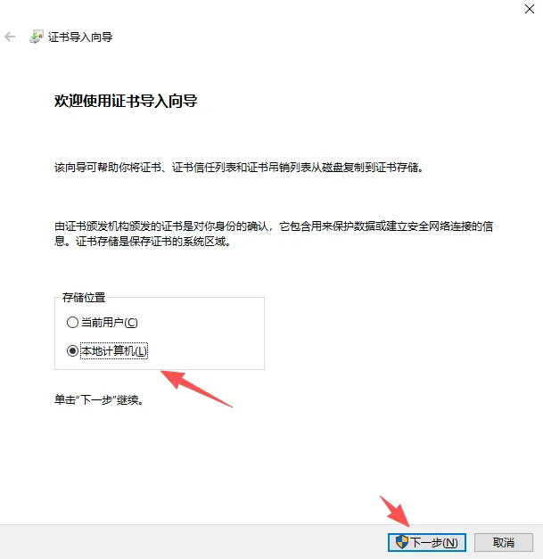 证书导入存储位置选择本地计算机,
