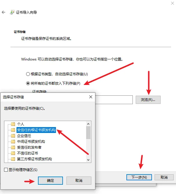 接着点击“浏览”选择“受信任的根证书颁发机构”最后确定,
