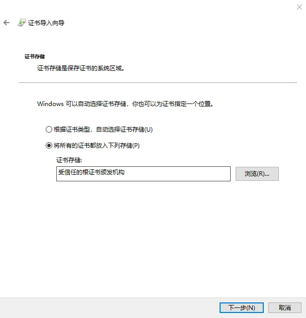 下一步选择“将所有的证书都放入下列存储(P)”,